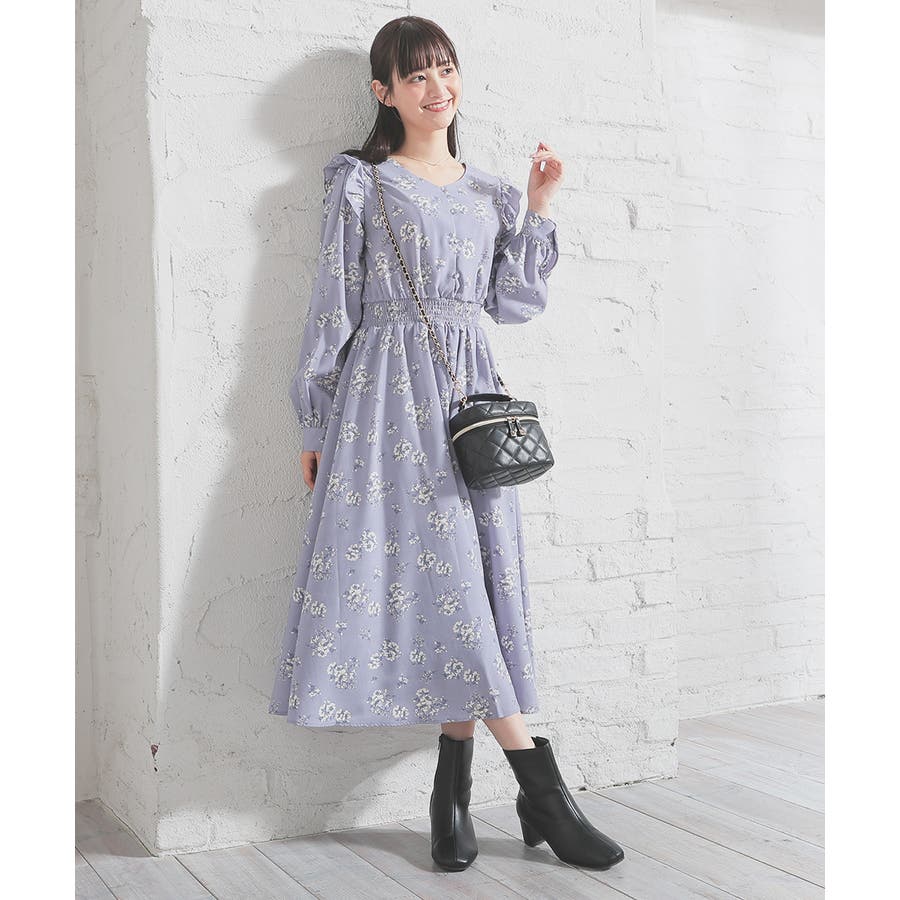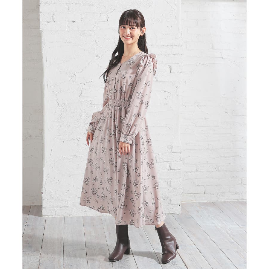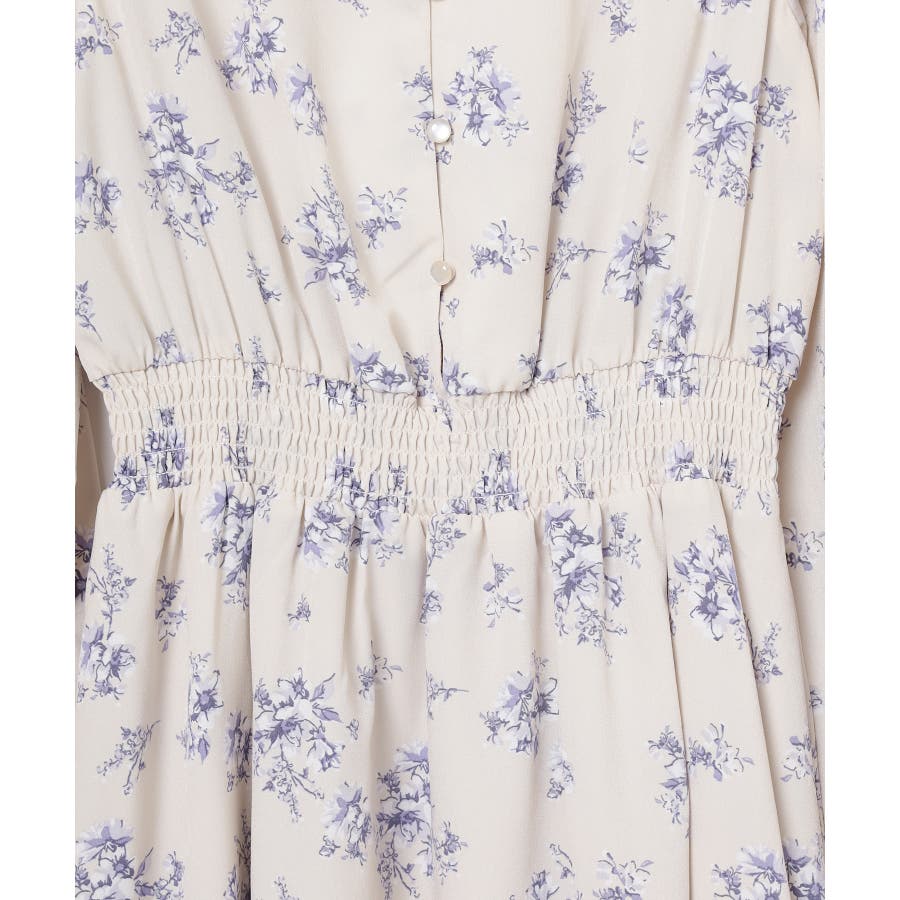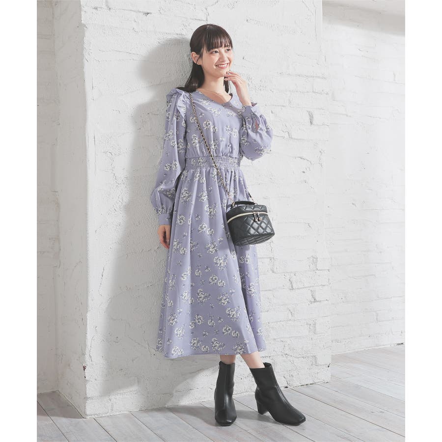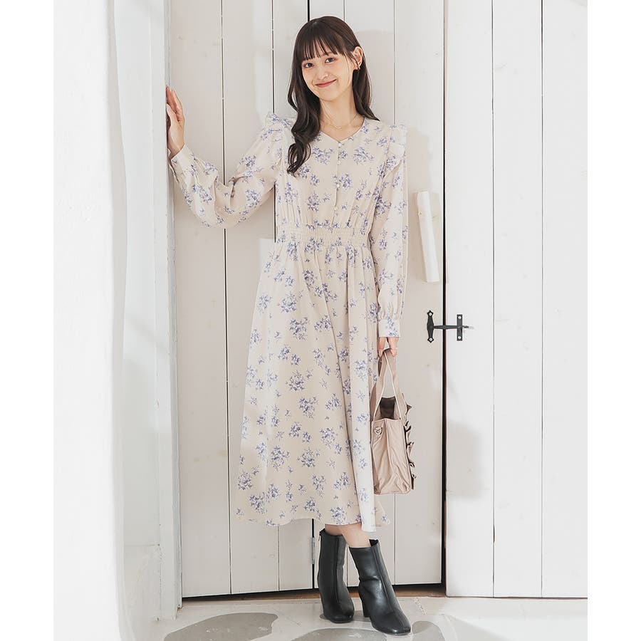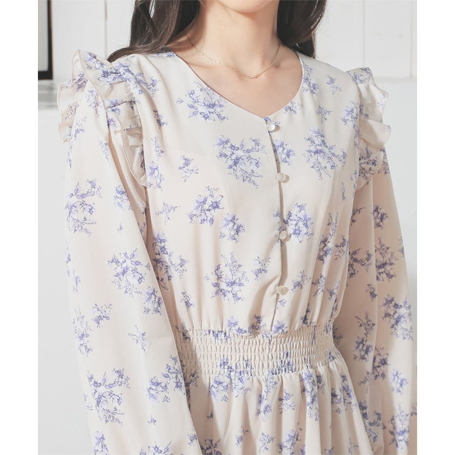 ウエストをシャーリングで絞ったメリハリシルエットに、肩フリルやふんわり袖、花柄とフェミニンムードたっぷりなデザイン。