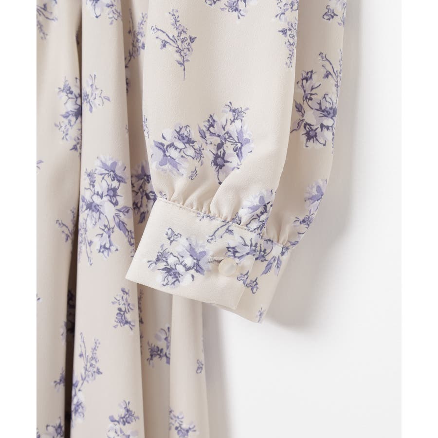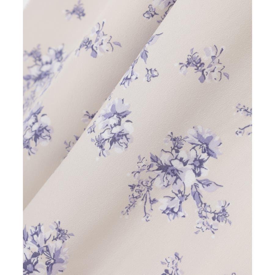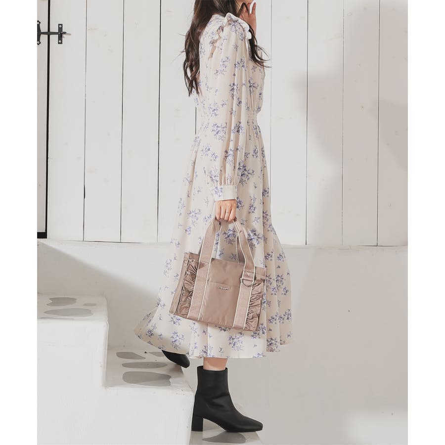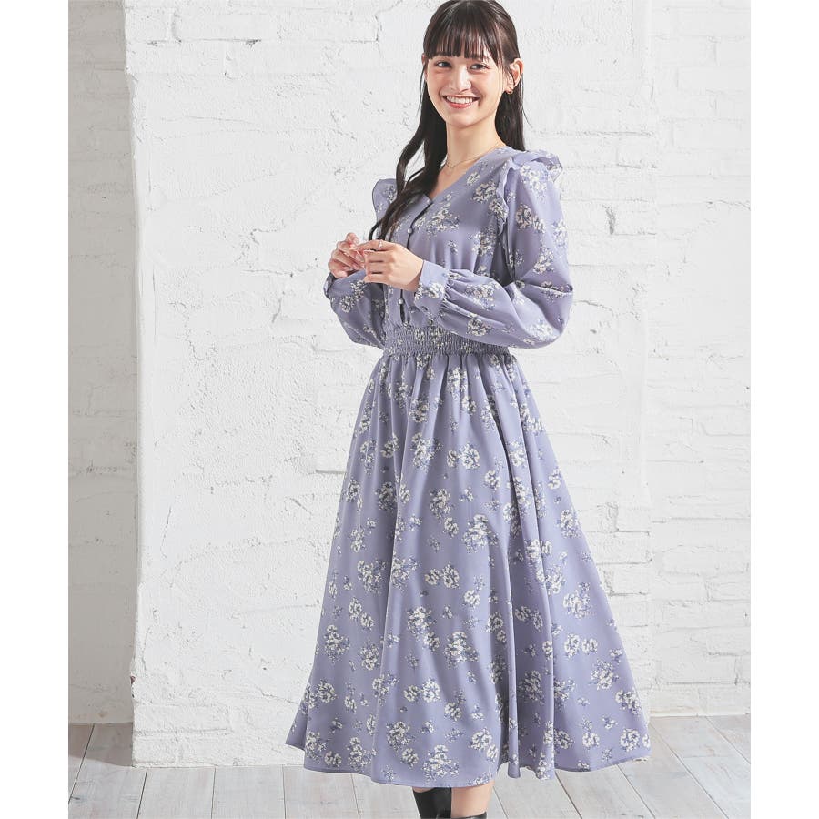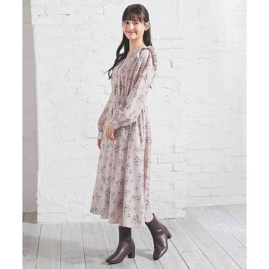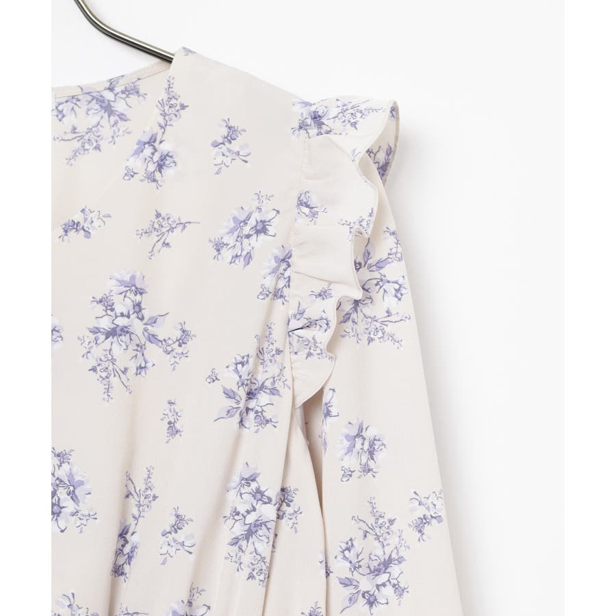 ウエストをシャーリングで絞ったメリハリシルエットに、肩フリルやふんわり袖、花柄とフェミニンムードたっぷりなデザイン。