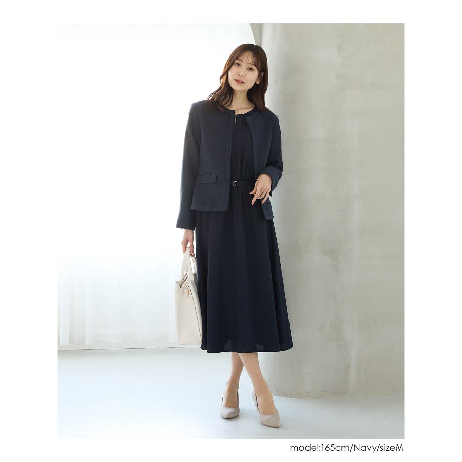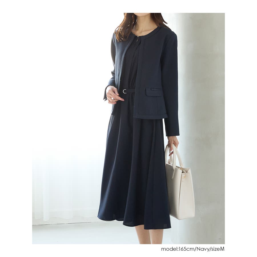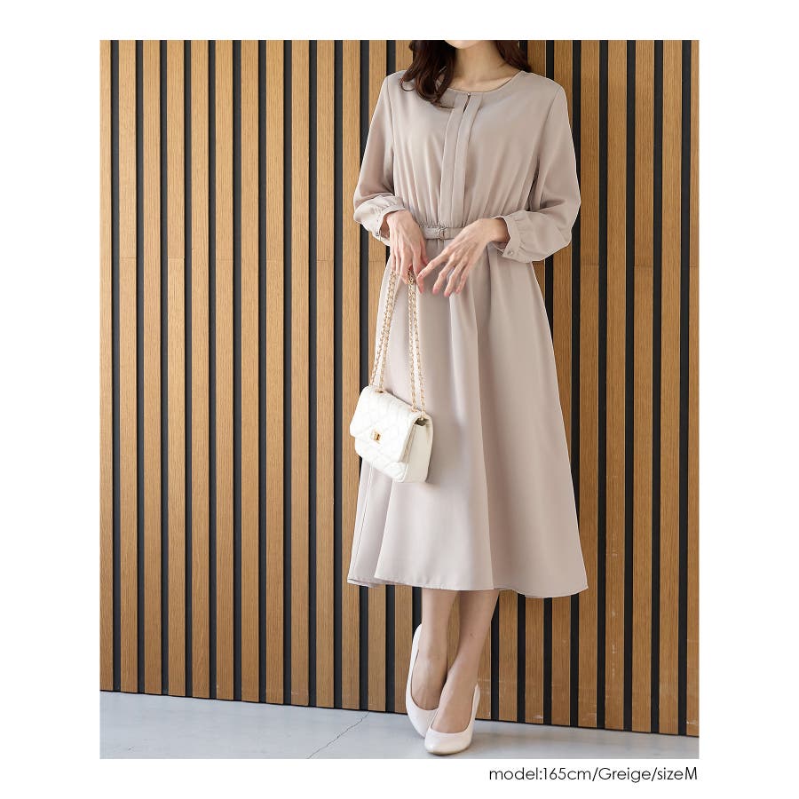 付属の共布ベルトでウエストマークすればスタイルアップ効果も◎