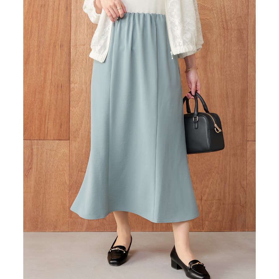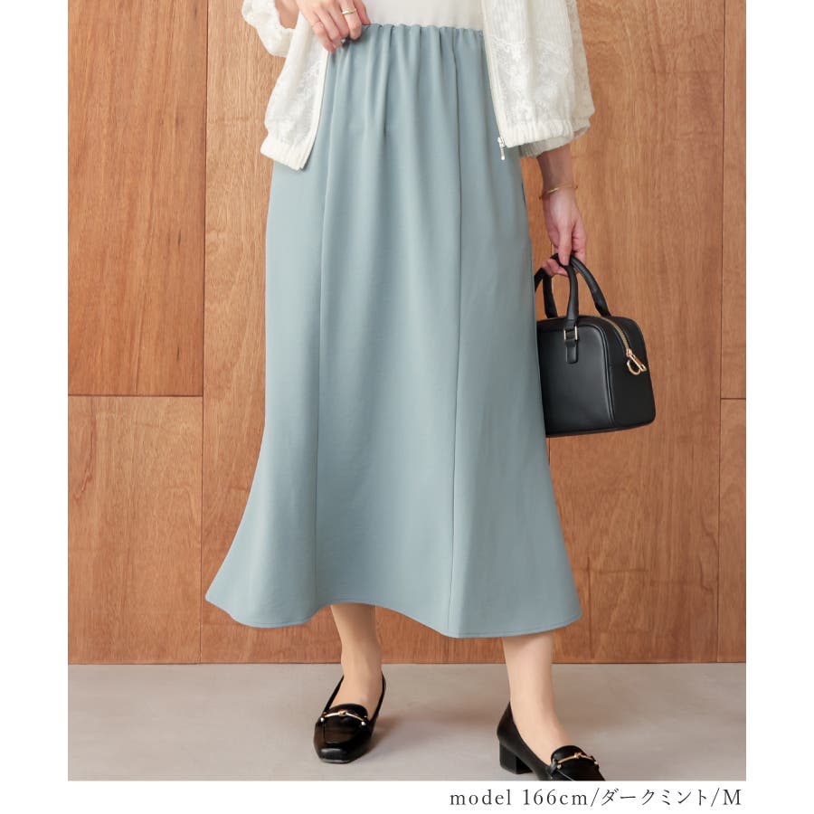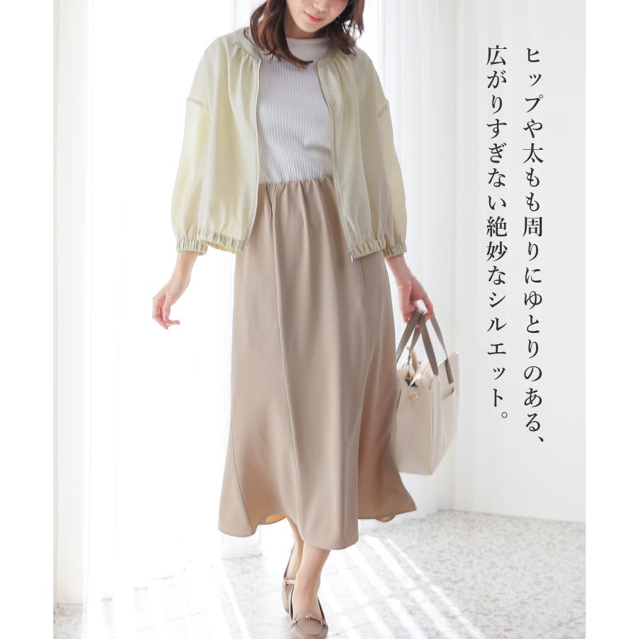 ヒップや太もも周りにゆとりのある、広がりすぎず体のラインを拾いすぎない絶妙なシルエットで、大人の女性に嬉しいデザイン。