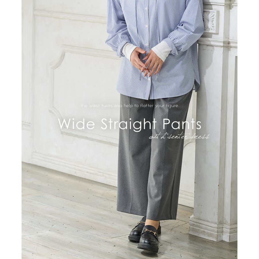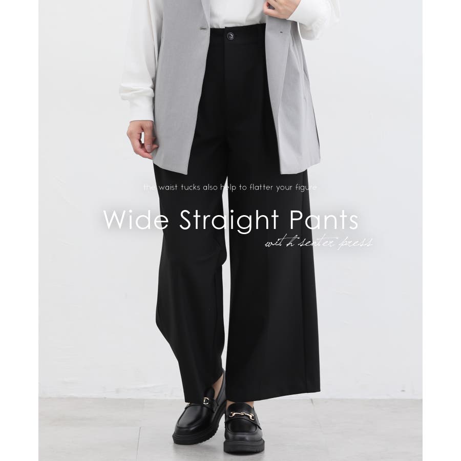 きちんと感のあるセンタープレス入りで、美脚効果も抜群のストレートパンツ、股下65cmタイプ。
