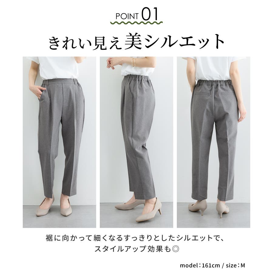きちんと感のあるセンタープレスと、腰回りのラインにこだわった、裾に向かって細くなる美しいシルエットで美脚効果も抜群。