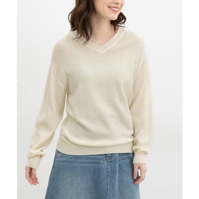 顔周りをすっきり見せるVネックのシンプルデザイン。