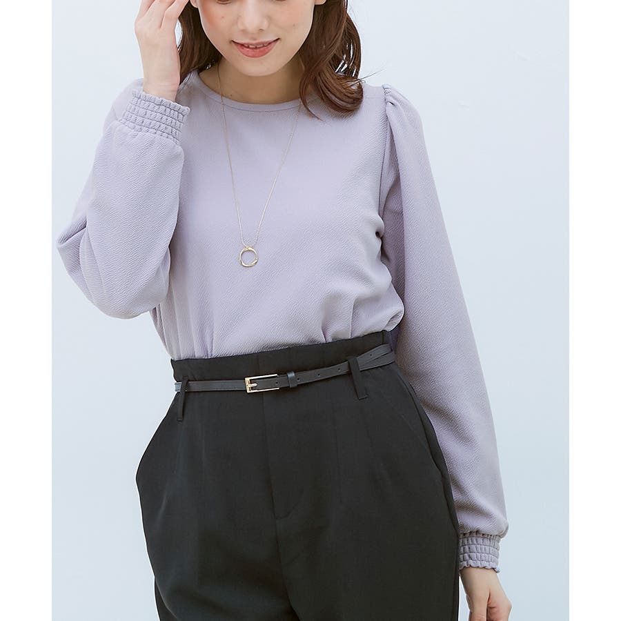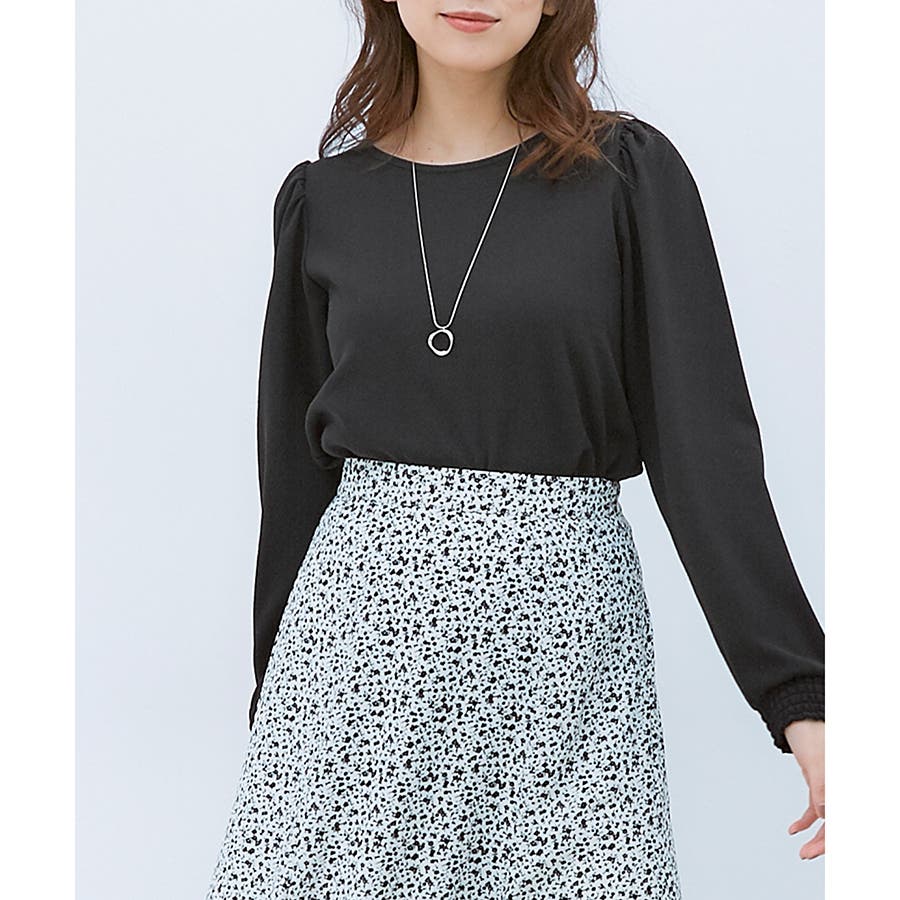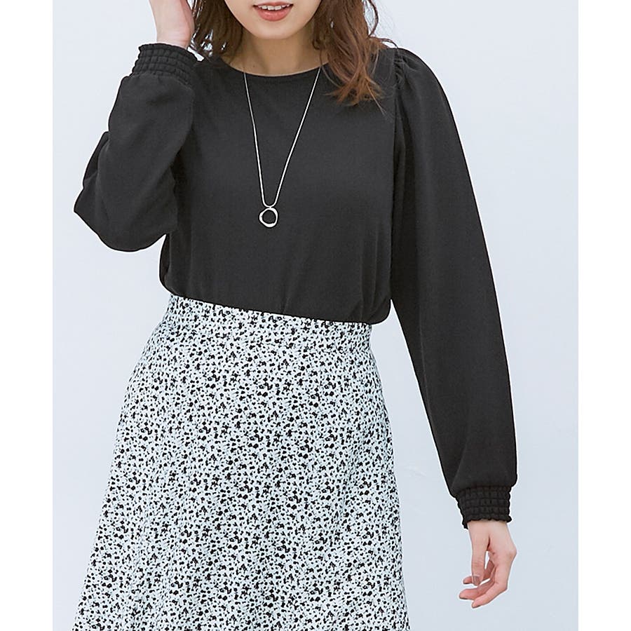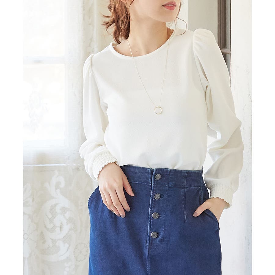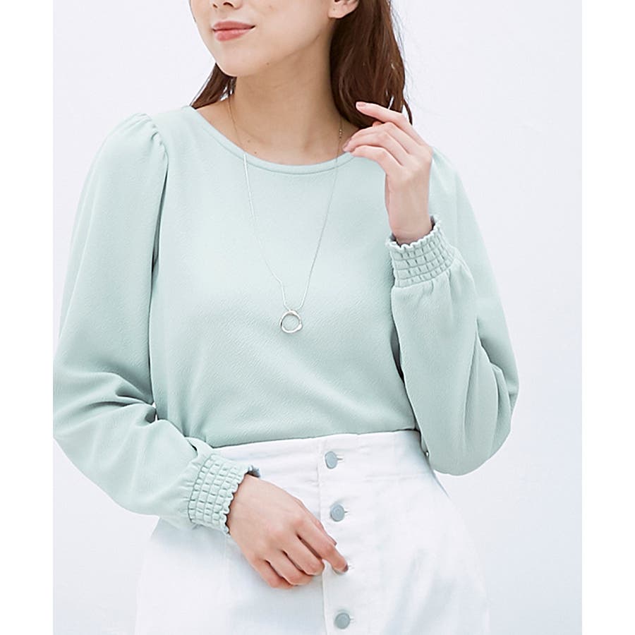 ふんわりとしたボリューム袖にゴムシャーリングをプラスした、女性らしいシルエットのトップス。