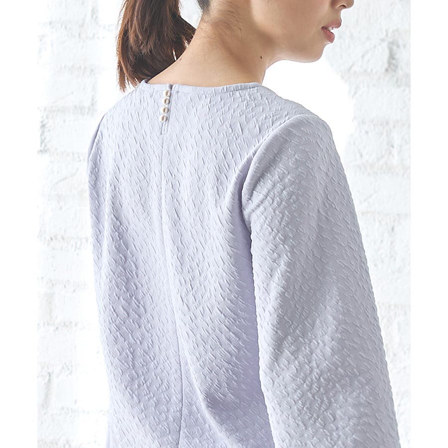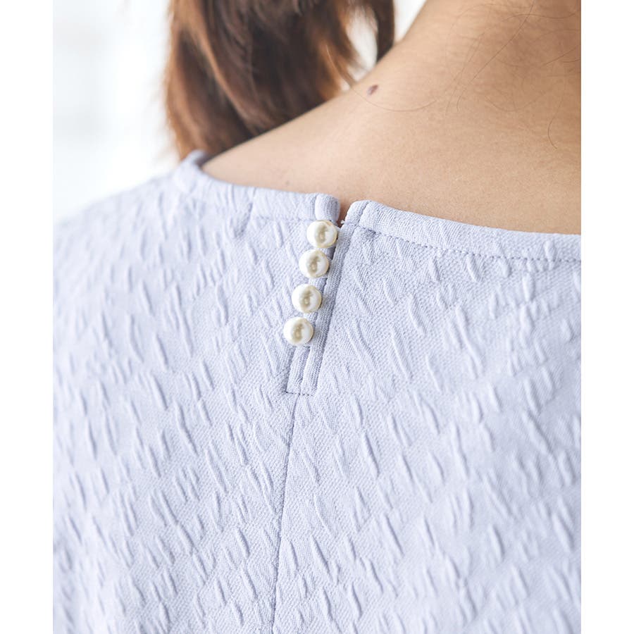 ポコポコ素材とバックネックのパール風ボタンが大人可愛いデザイン。