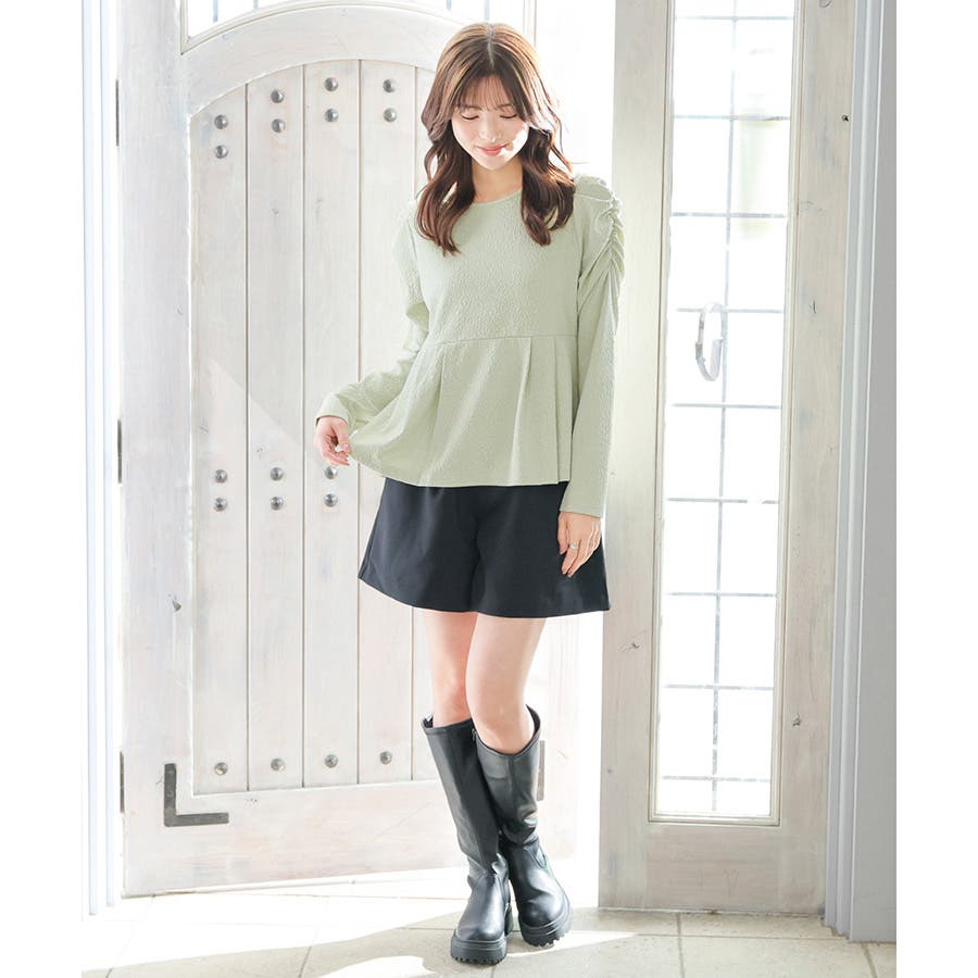 高めの位置で切り替えたペプラムシルエットでスタイルアップ効果も◎