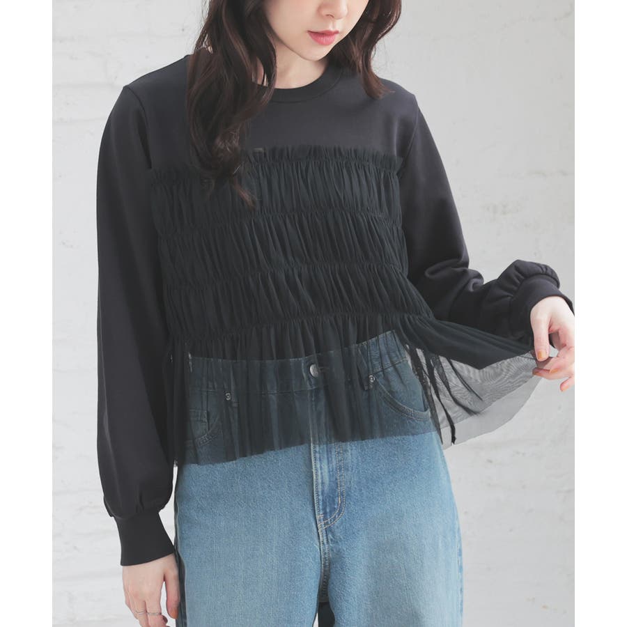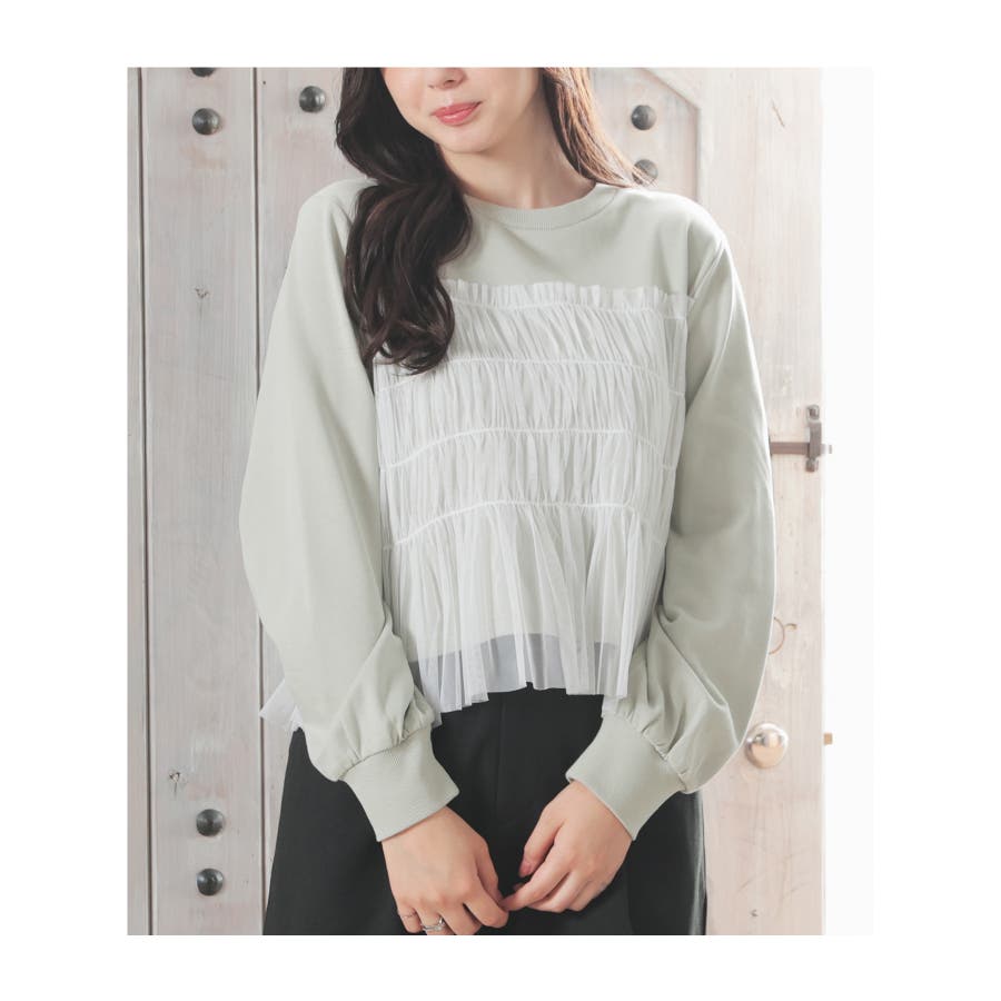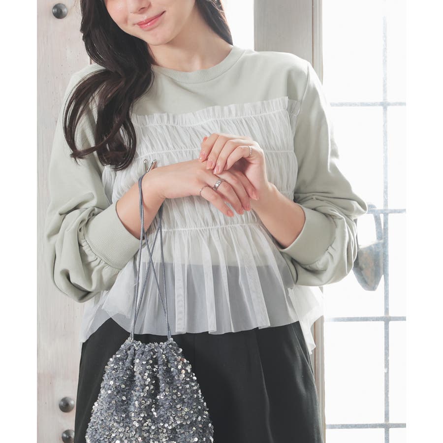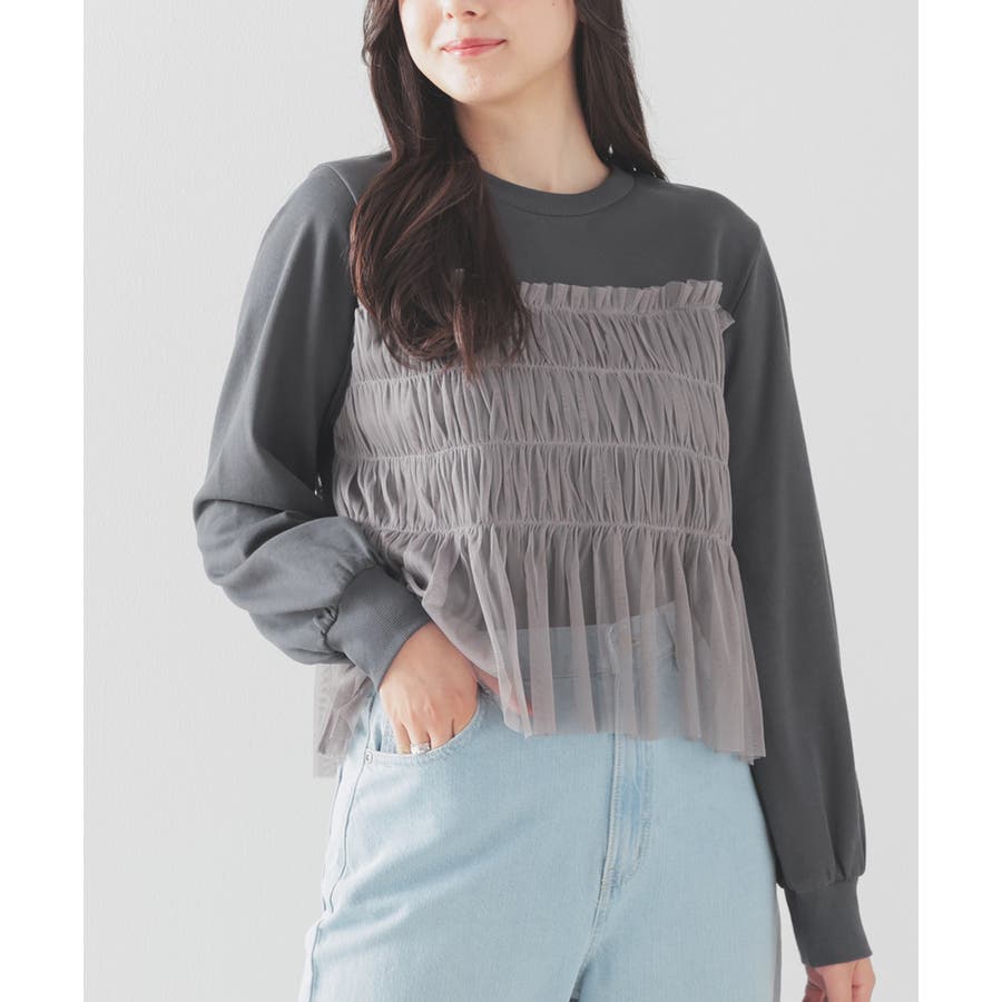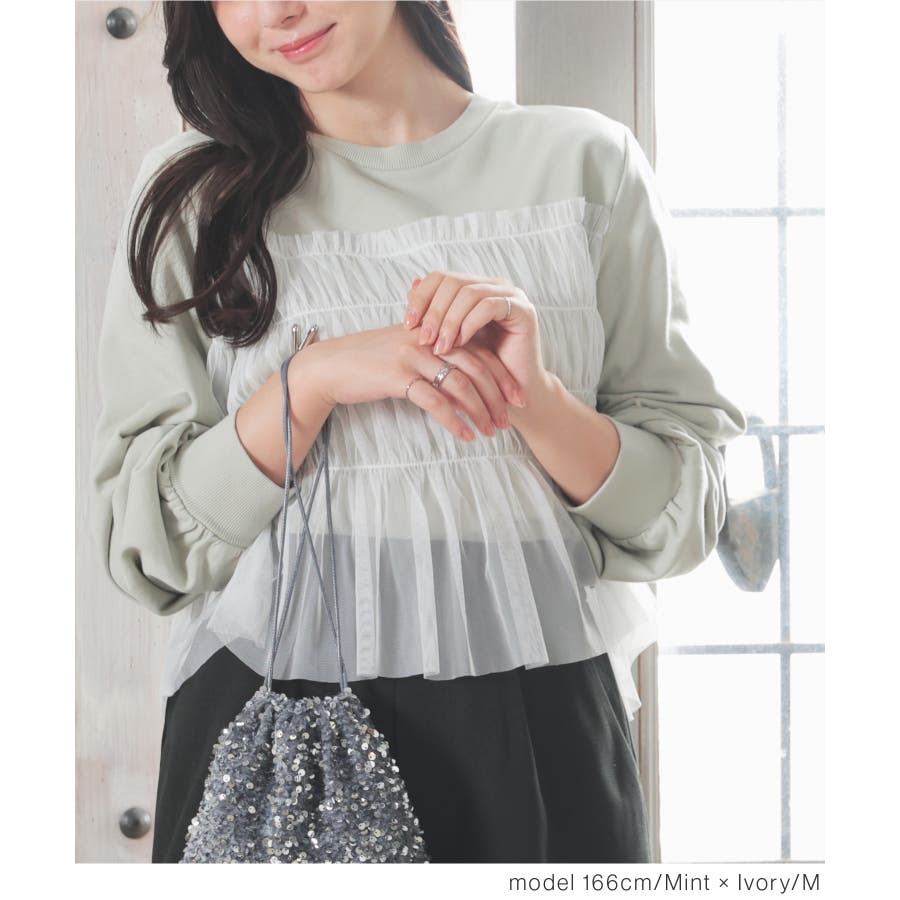 シンプルなトレーナーにチュールをビスチェ風にドッキングした、1枚で着映えするガーリーなデザイン。
