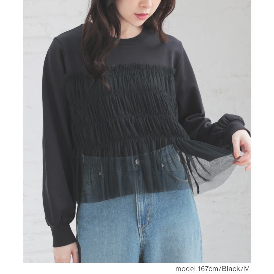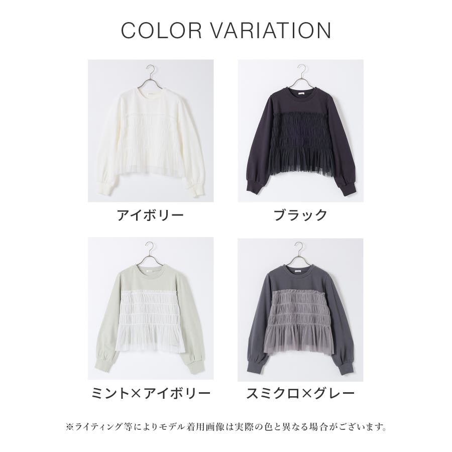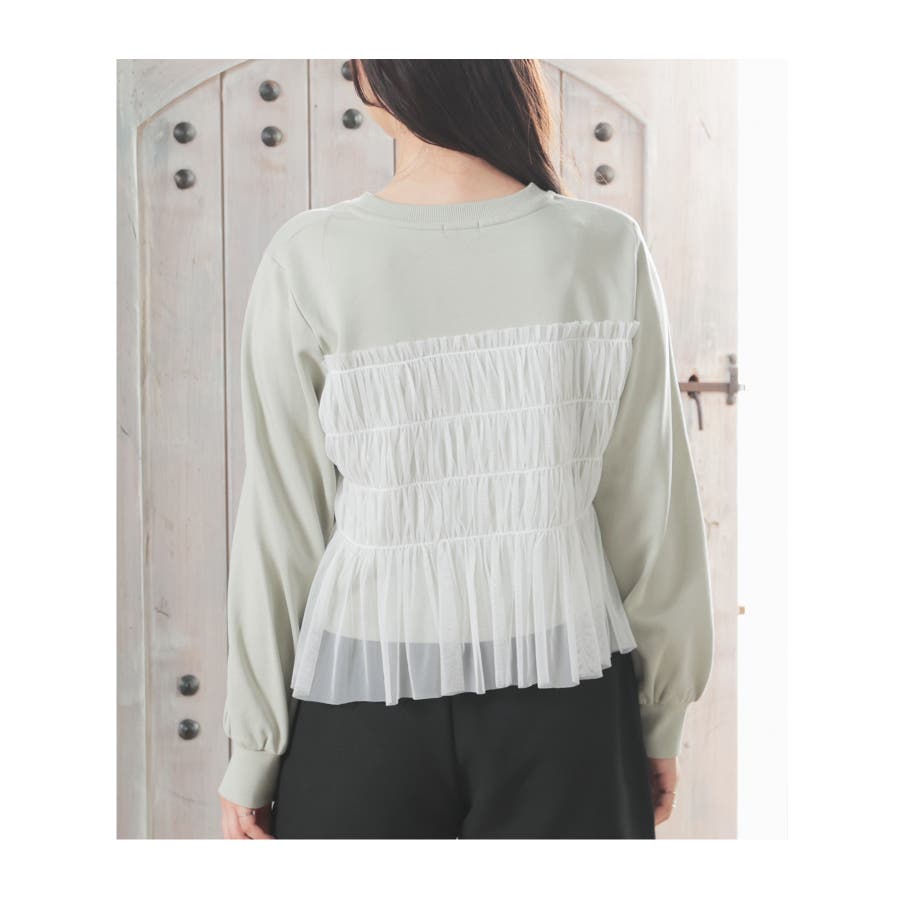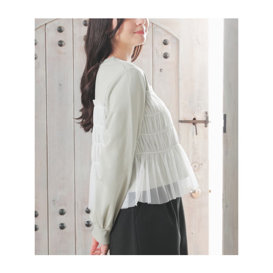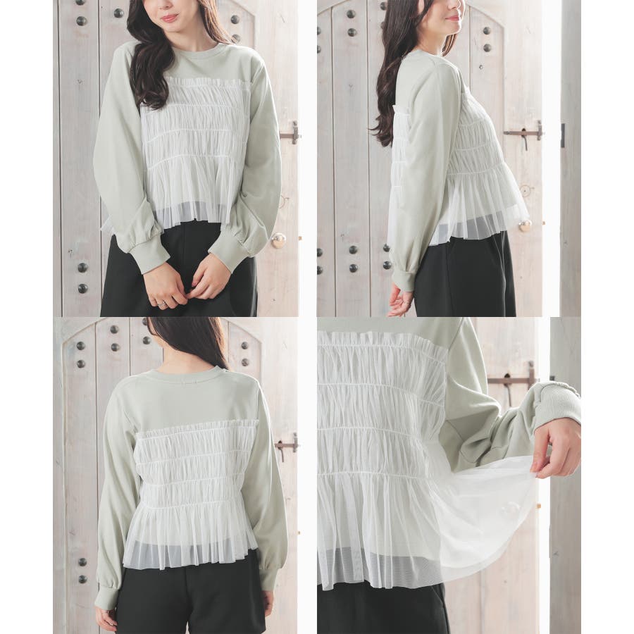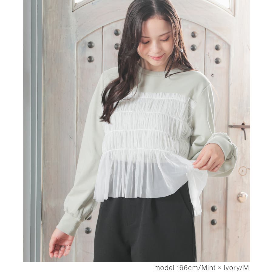 シンプルなトレーナーにチュールをビスチェ風にドッキングした、1枚で着映えするガーリーなデザイン。