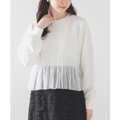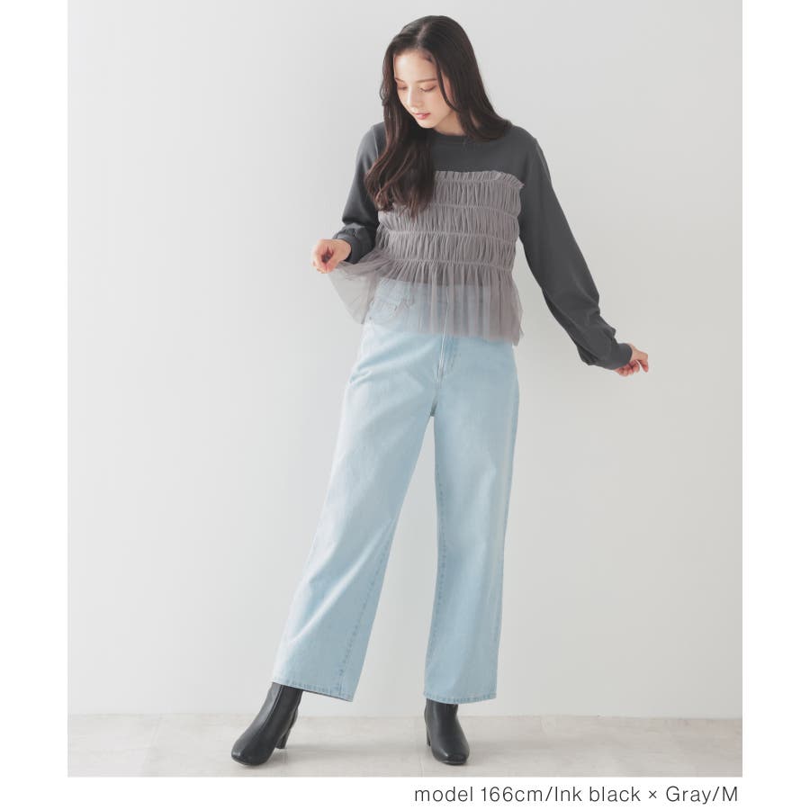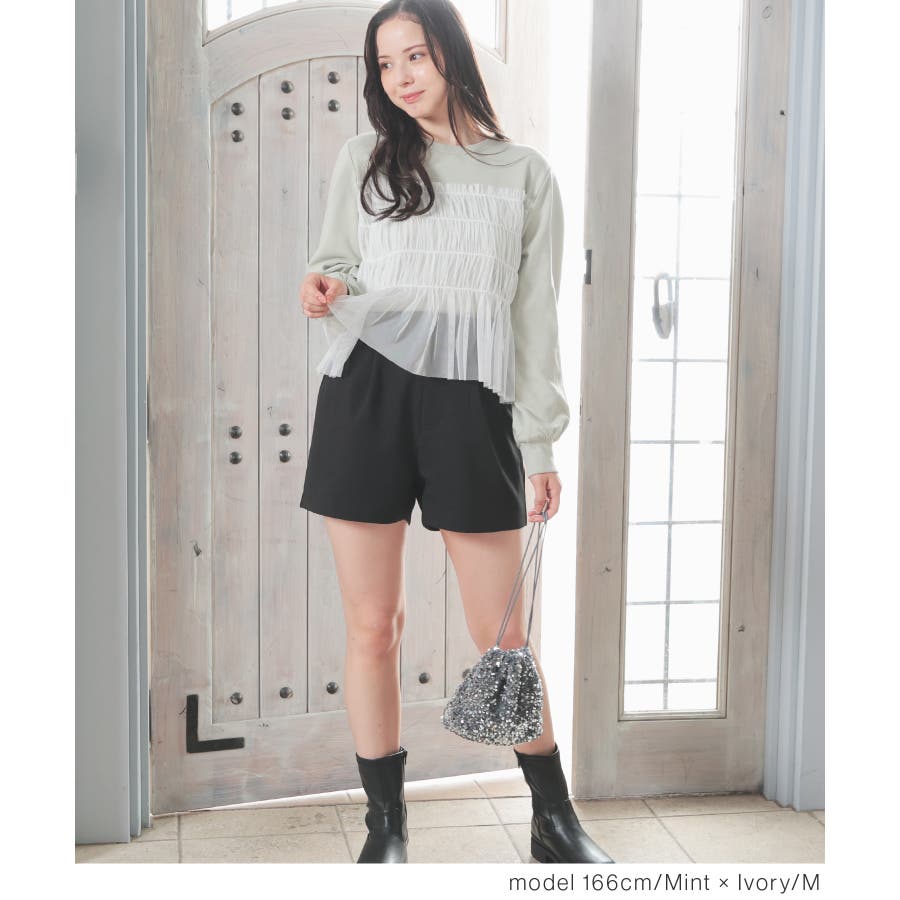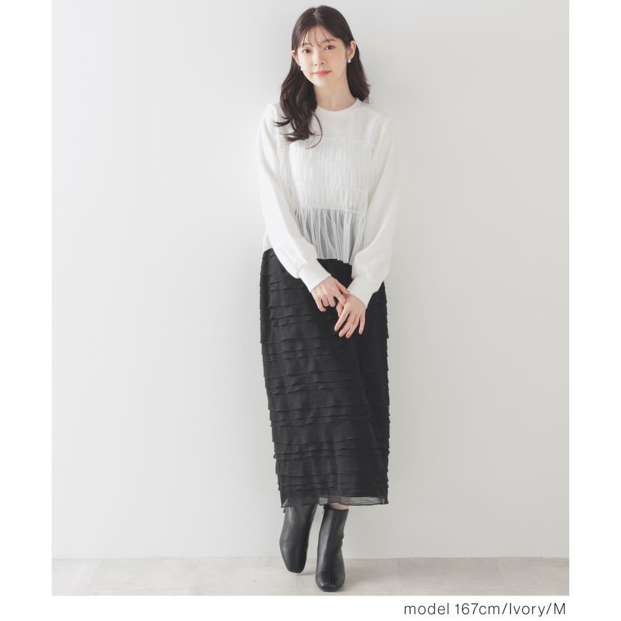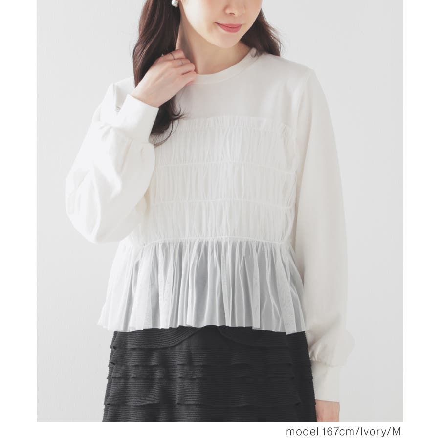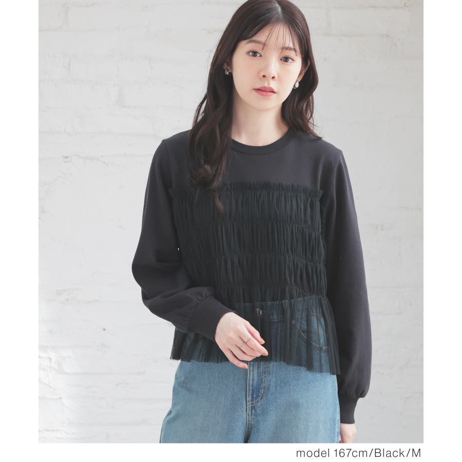 シンプルなトレーナーにチュールをビスチェ風にドッキングした、1枚で着映えするガーリーなデザイン。