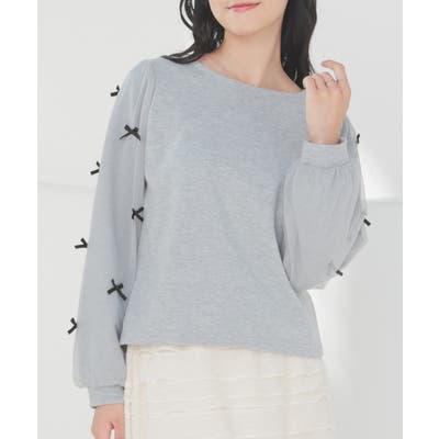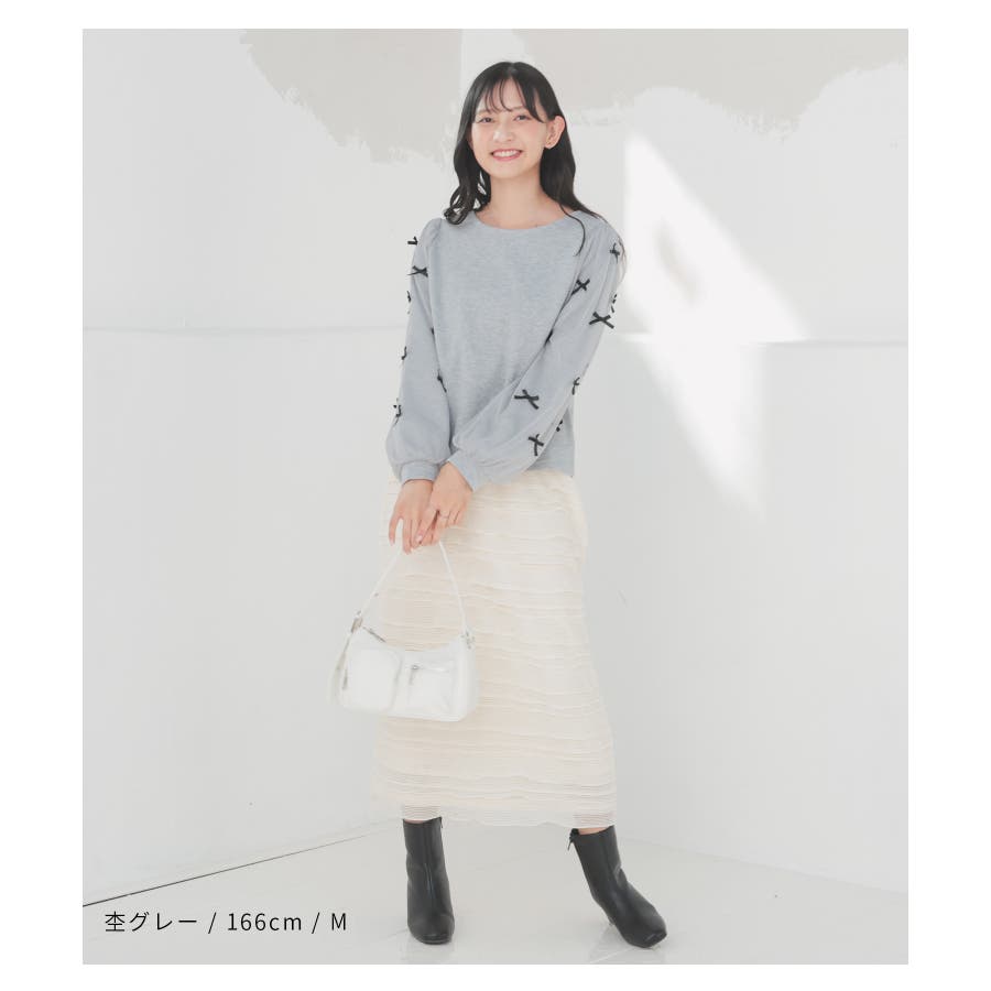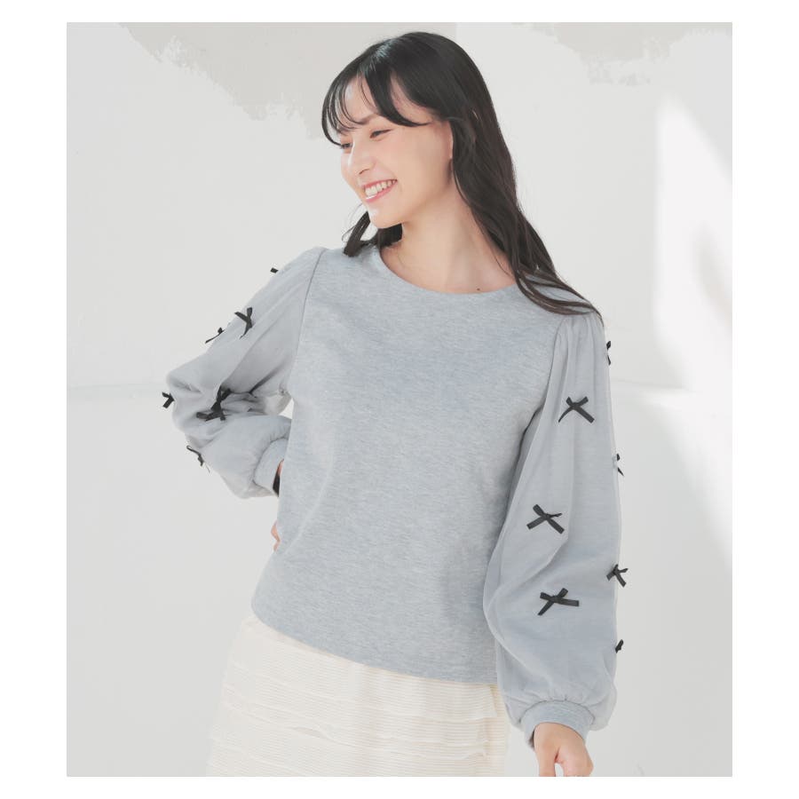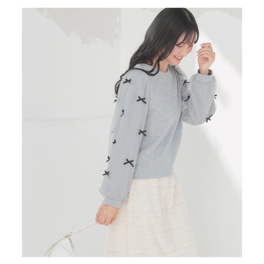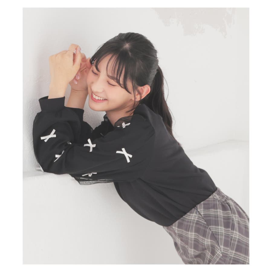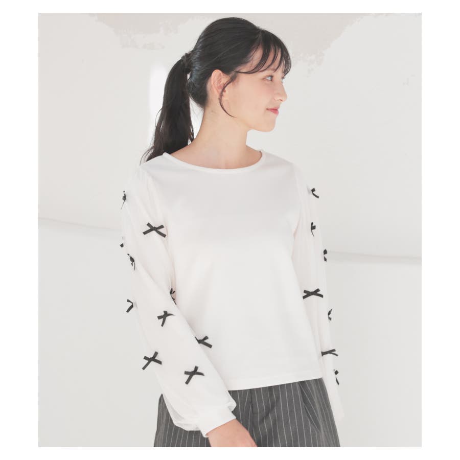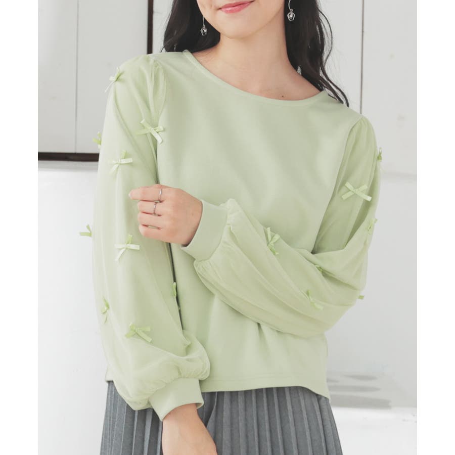 チュールを重ねた袖にモチーフリボンを散りばめたキュートなデザイン。