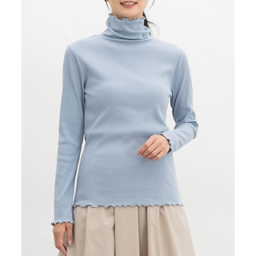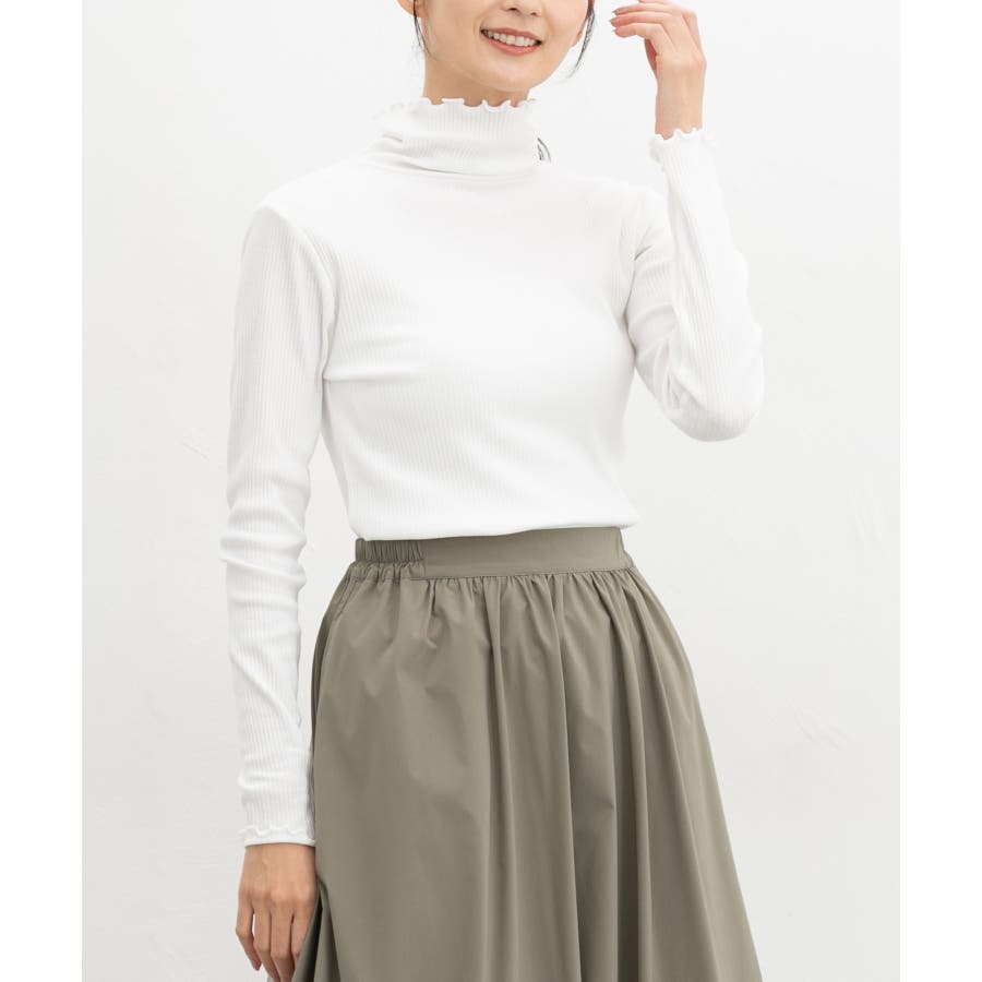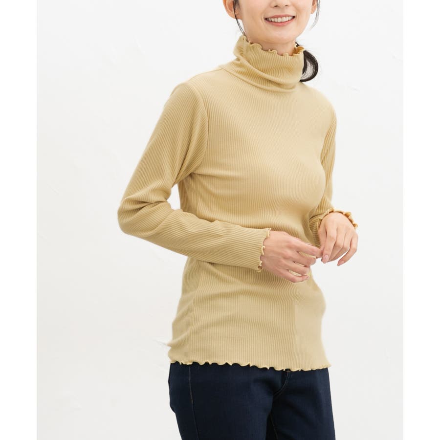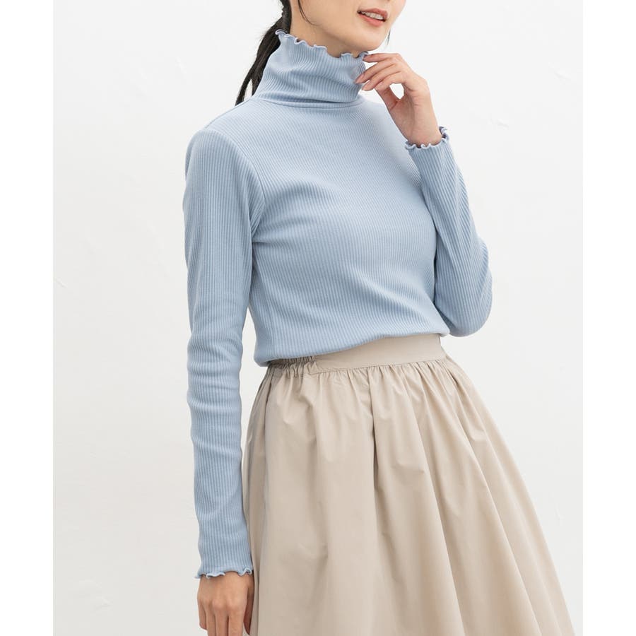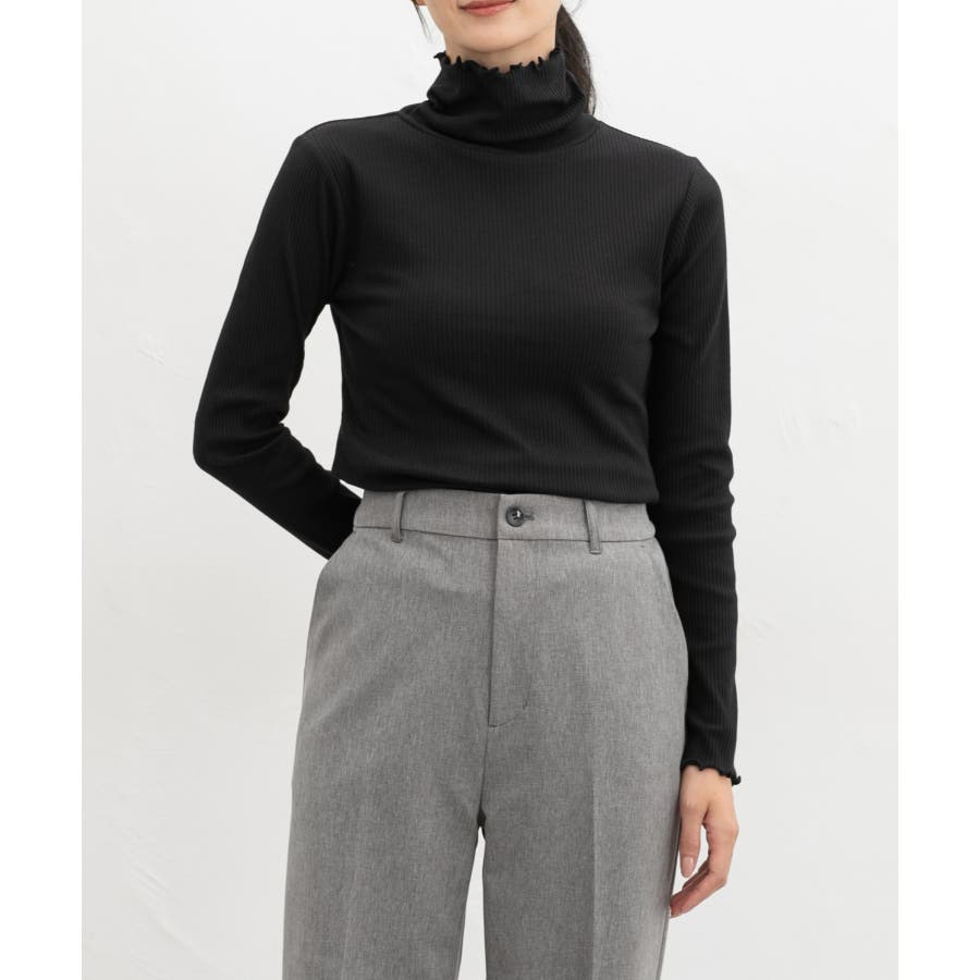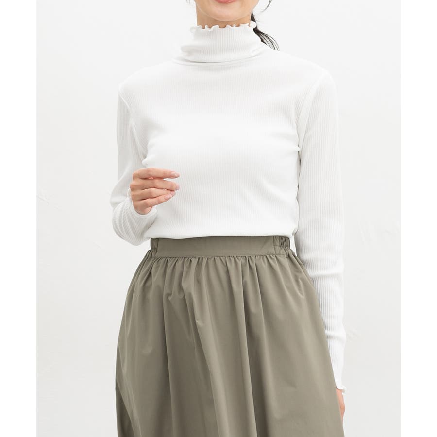 首まであったかなタートルネックのシンプルデザインに、衿・袖口・裾のメローロックがさりげなくフェミニンなアクセント。