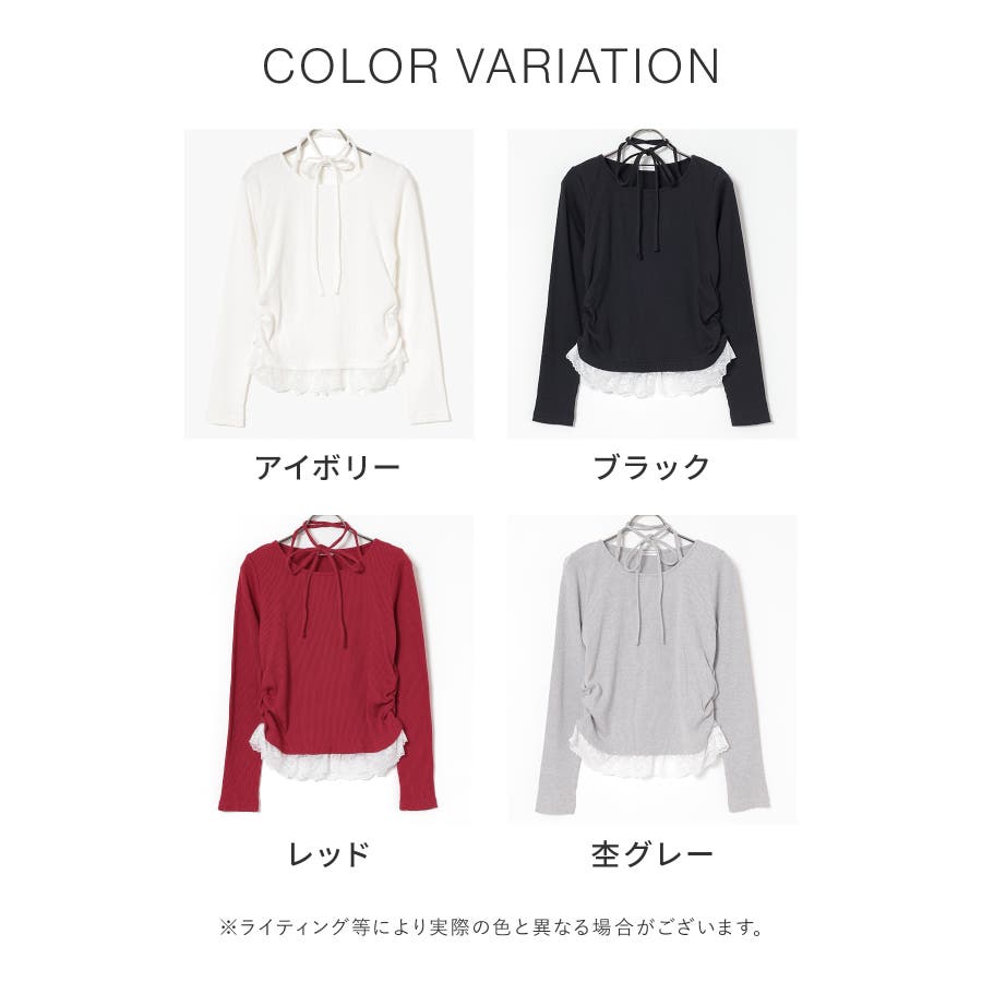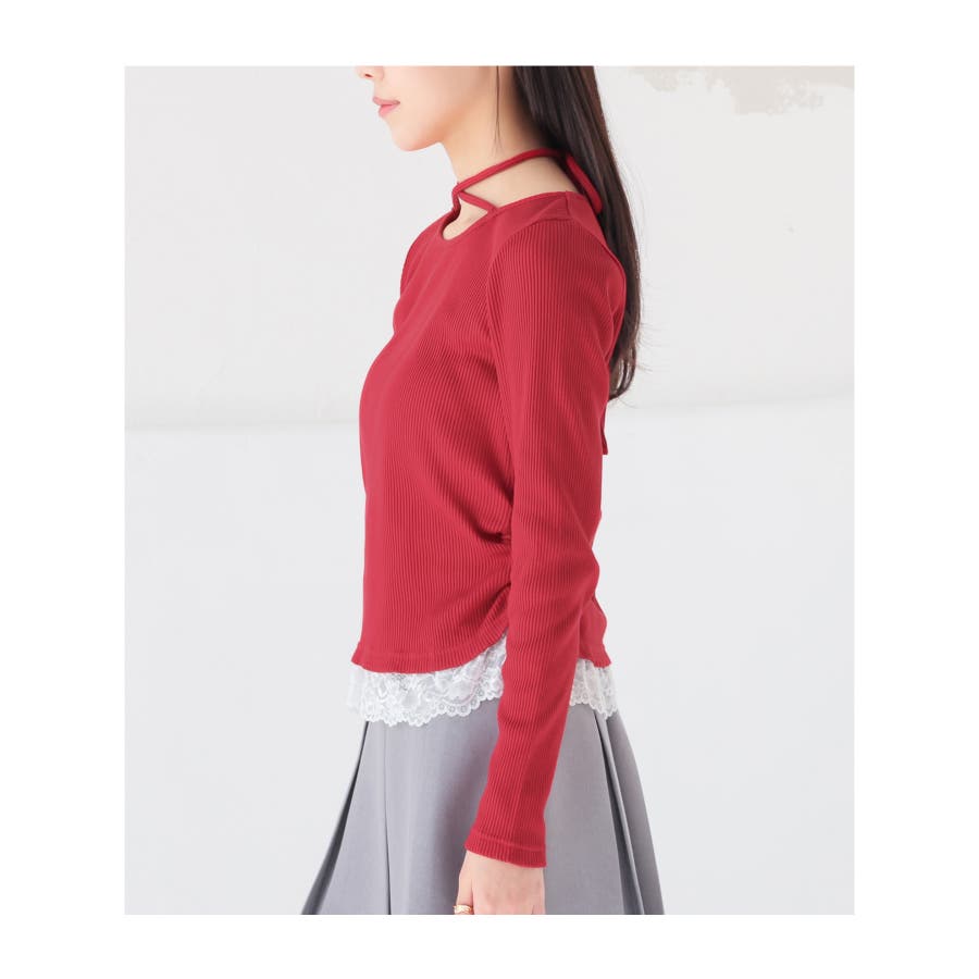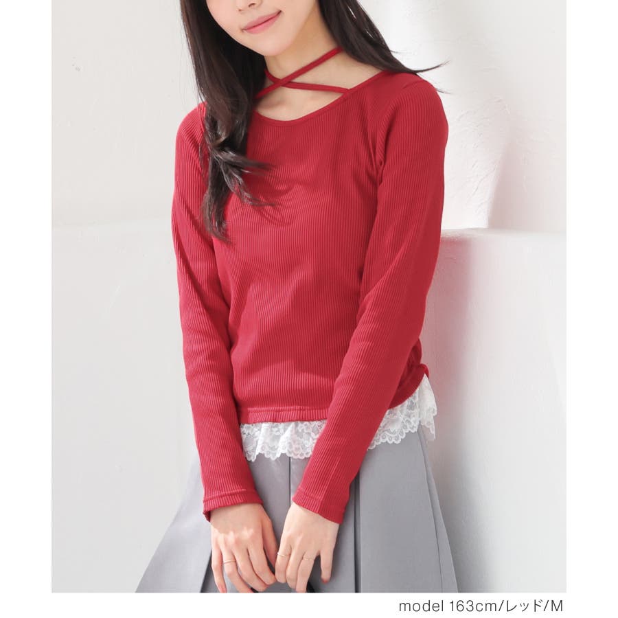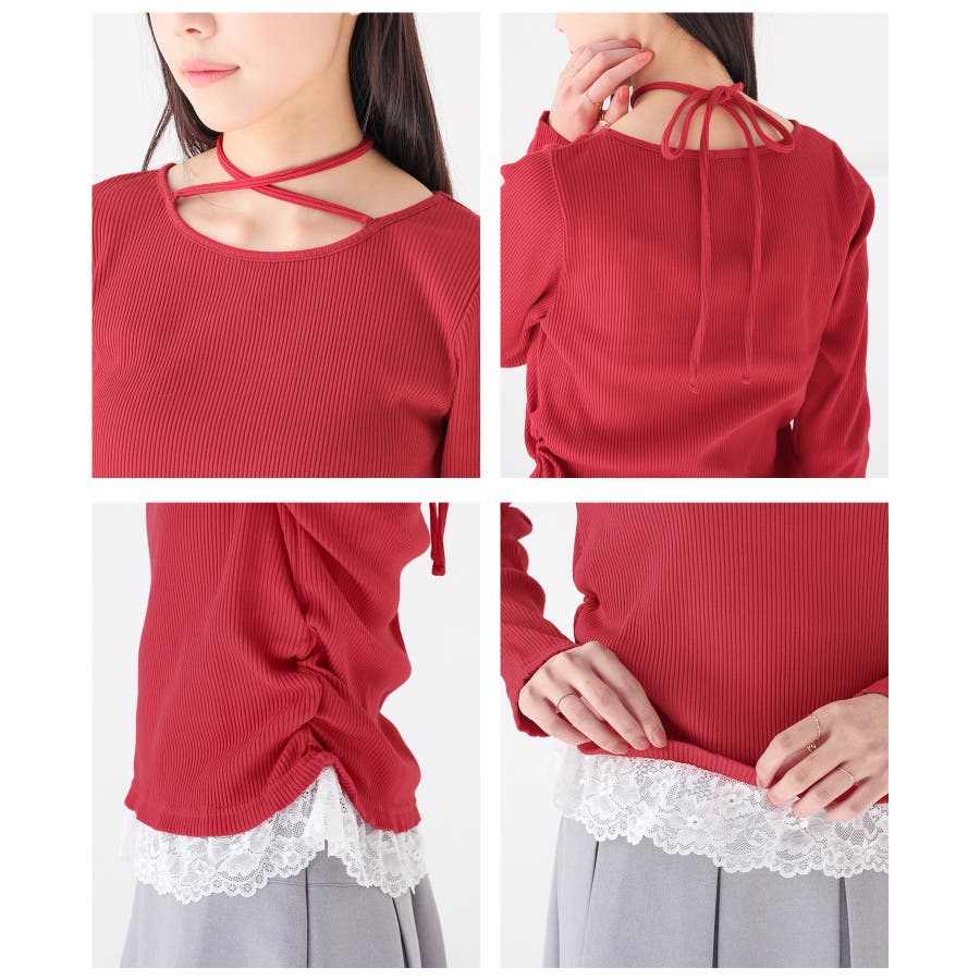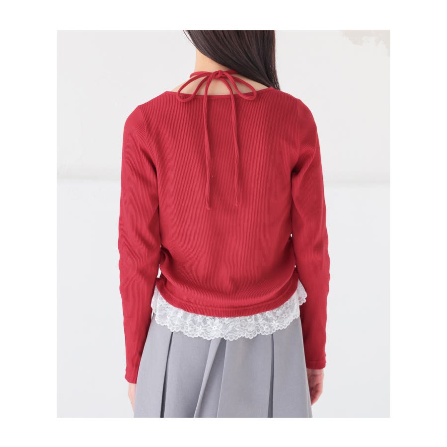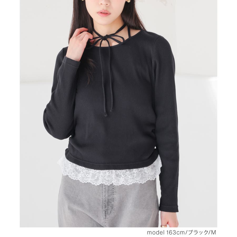 ホルターネックとして後ろで結んでも、チョーカー風に前で結んでも使えるリボン付きトップスの裾にレースを付けた、1枚で簡単にトレンドのレイヤード風コーデが完成するデザイン。