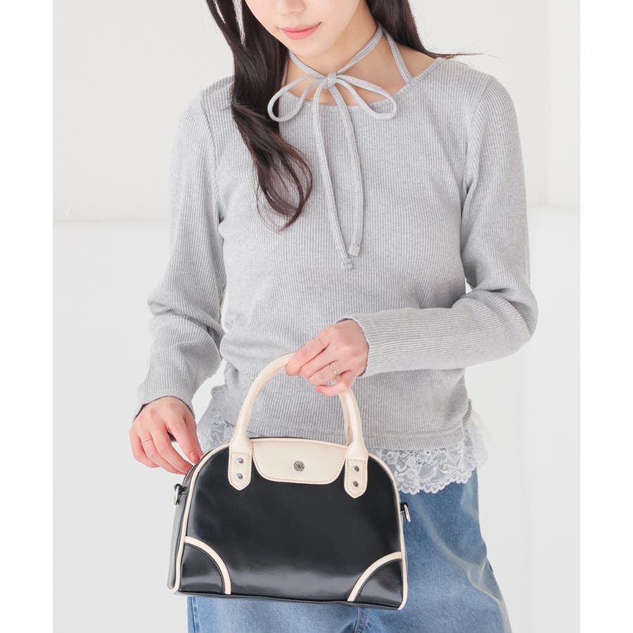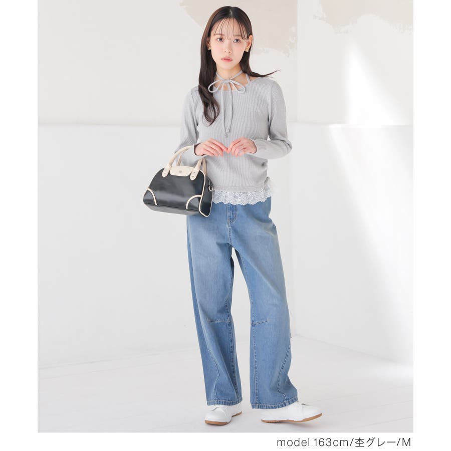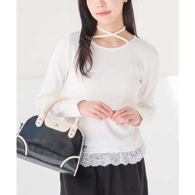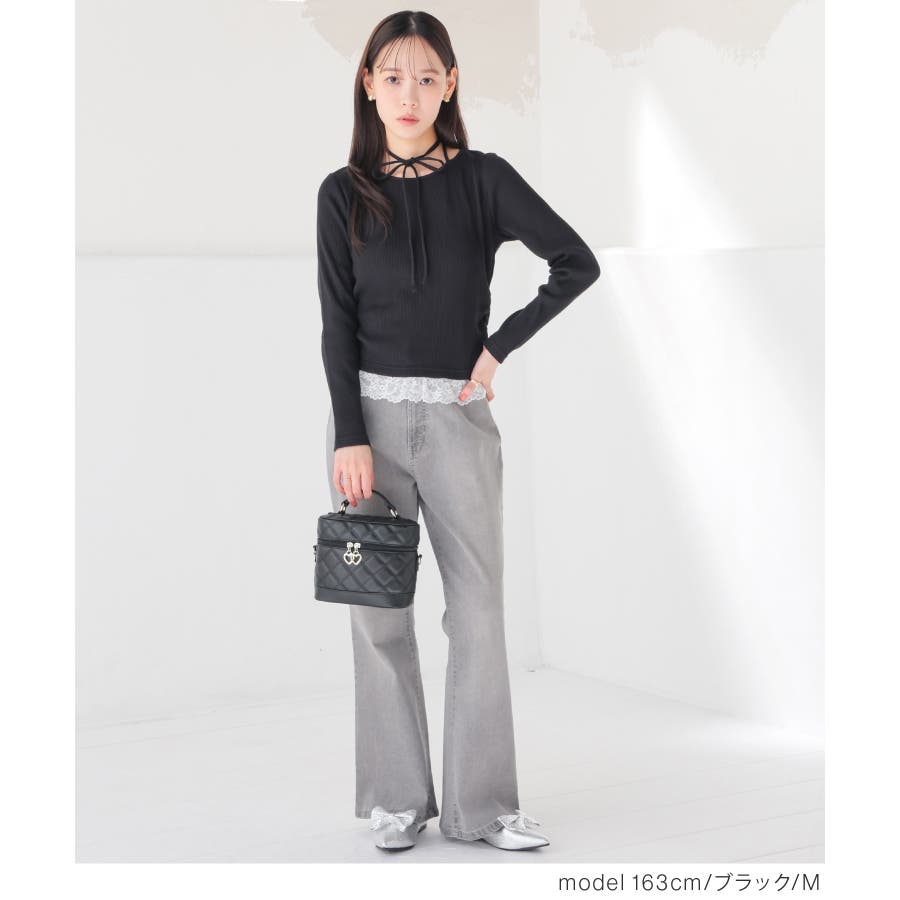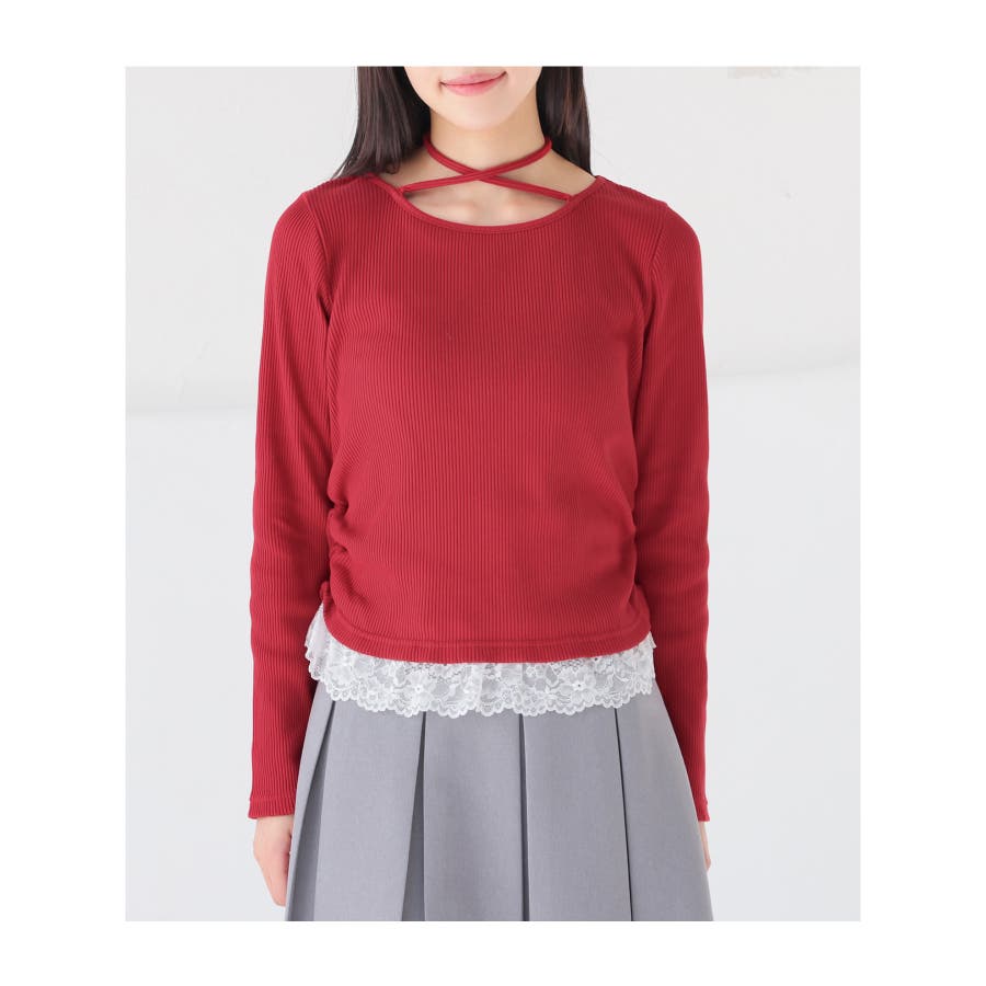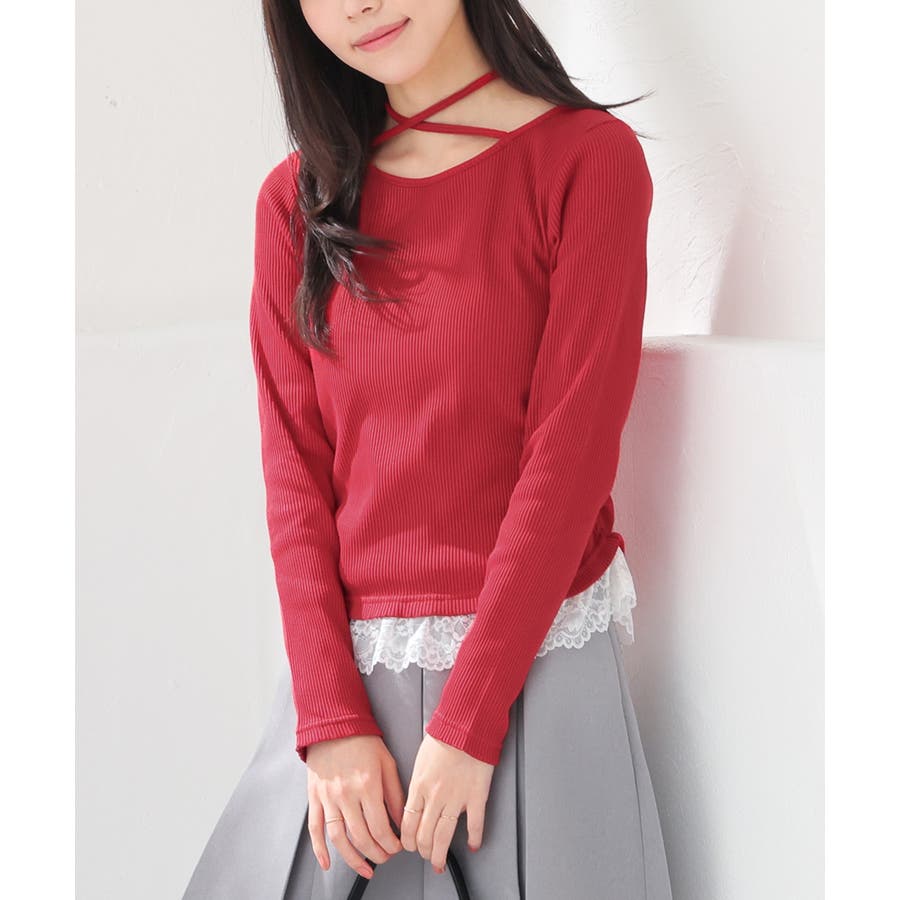 ホルターネックとして後ろで結んでも、チョーカー風に前で結んでも使えるリボン付きトップスの裾にレースを付けた、1枚で簡単にトレンドのレイヤード風コーデが完成するデザイン。