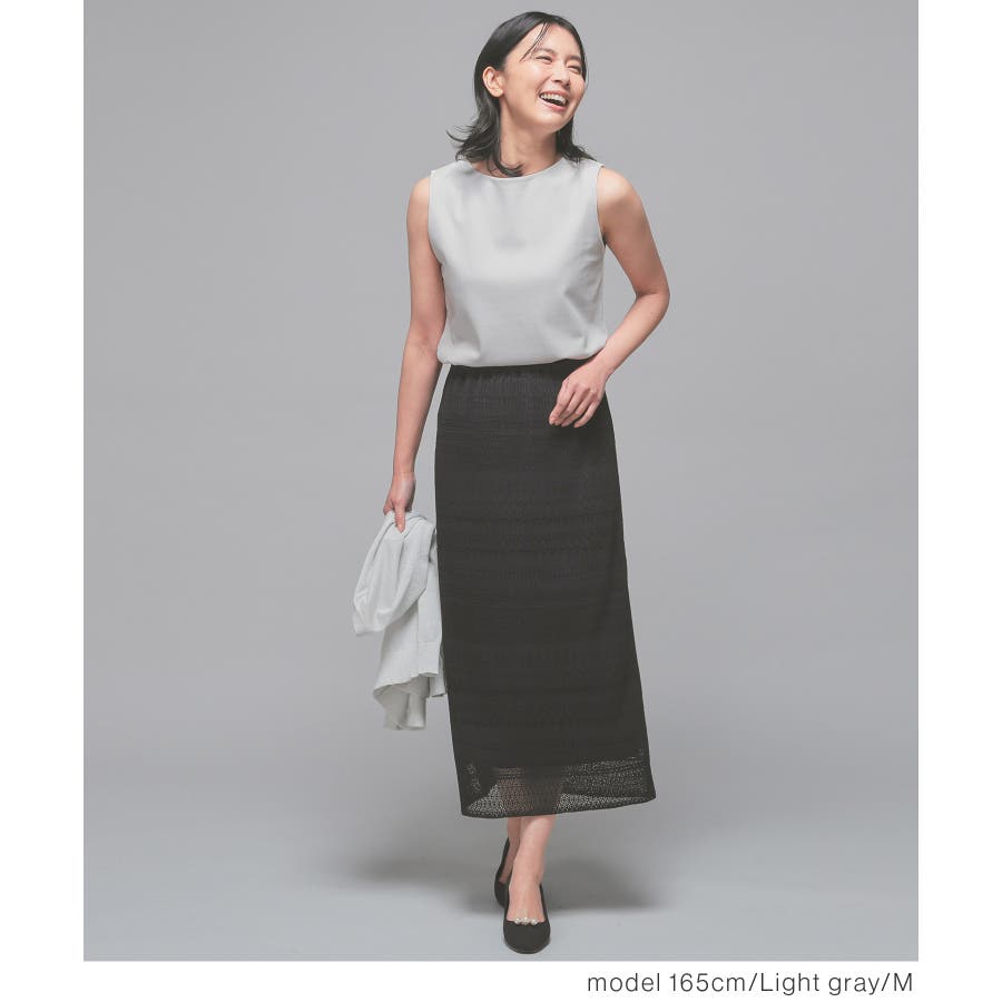 デコルテ部分の露出控えめなボートネックとステッチのない衿ぐりで上品見えする、シンプルで着回しやすいデザイン。