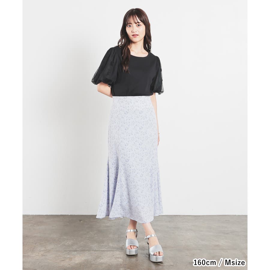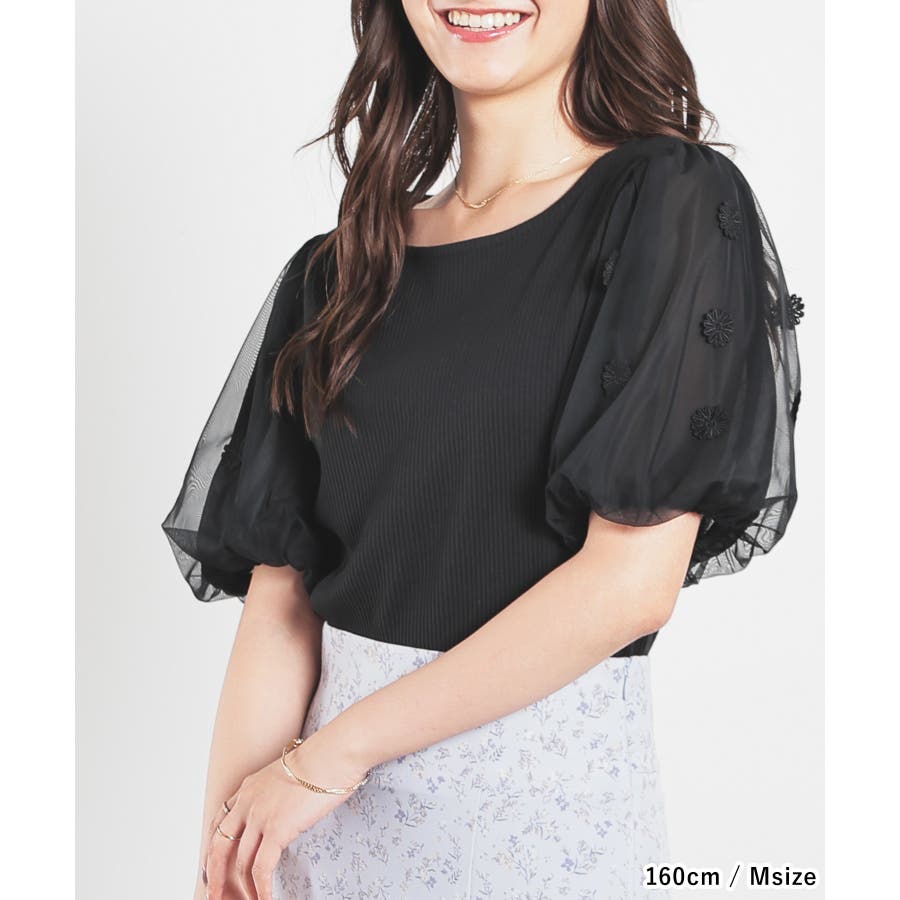 透け感のあるシフォンとチュールを重ねたふんわり袖に、立体的なフラワーモチーフを散りばめたキュートなデザイン。