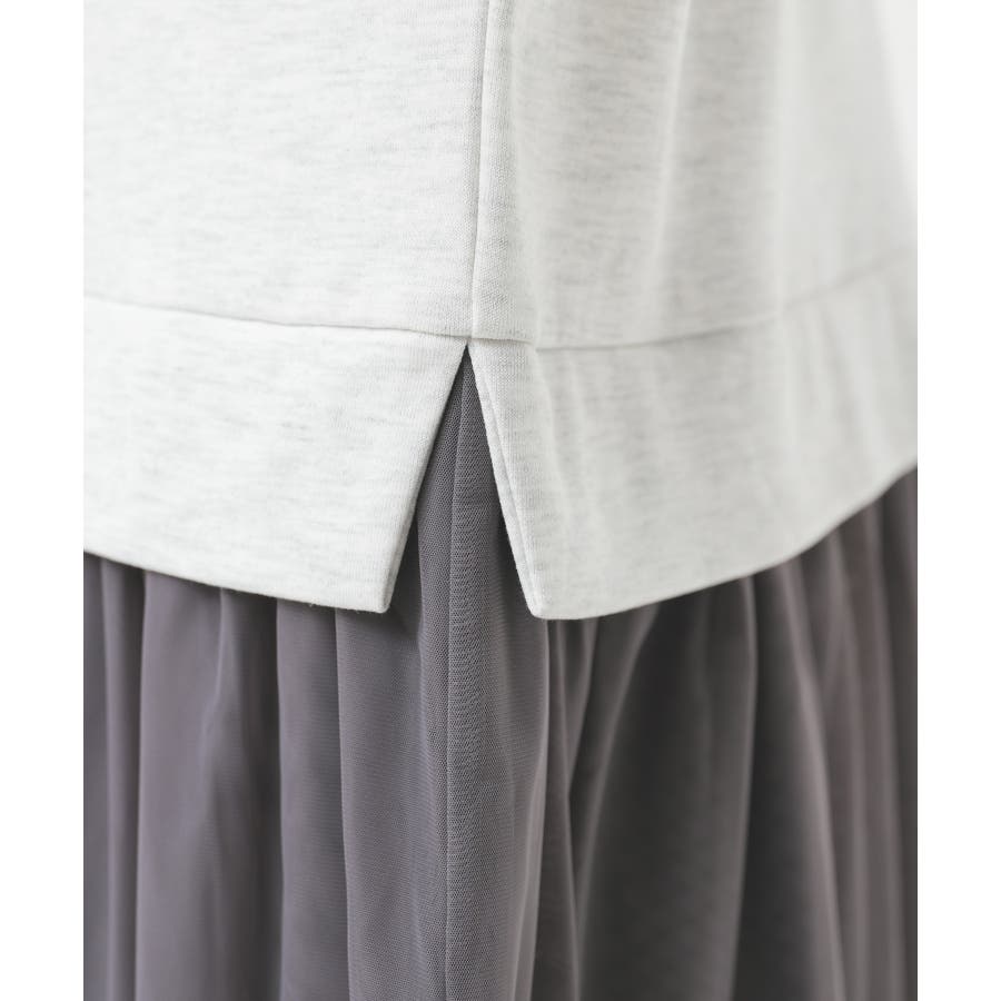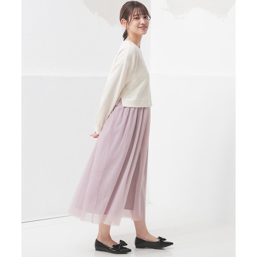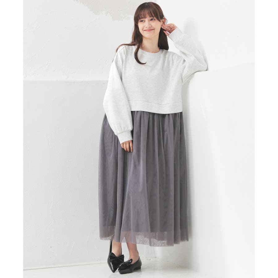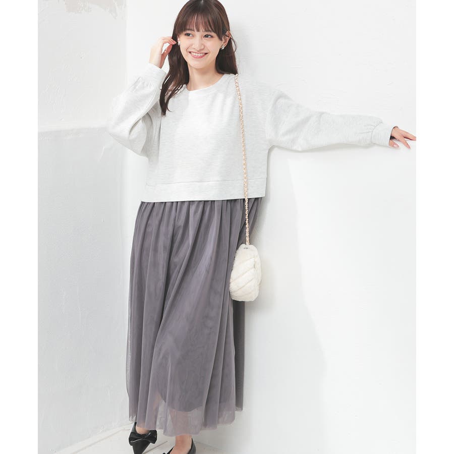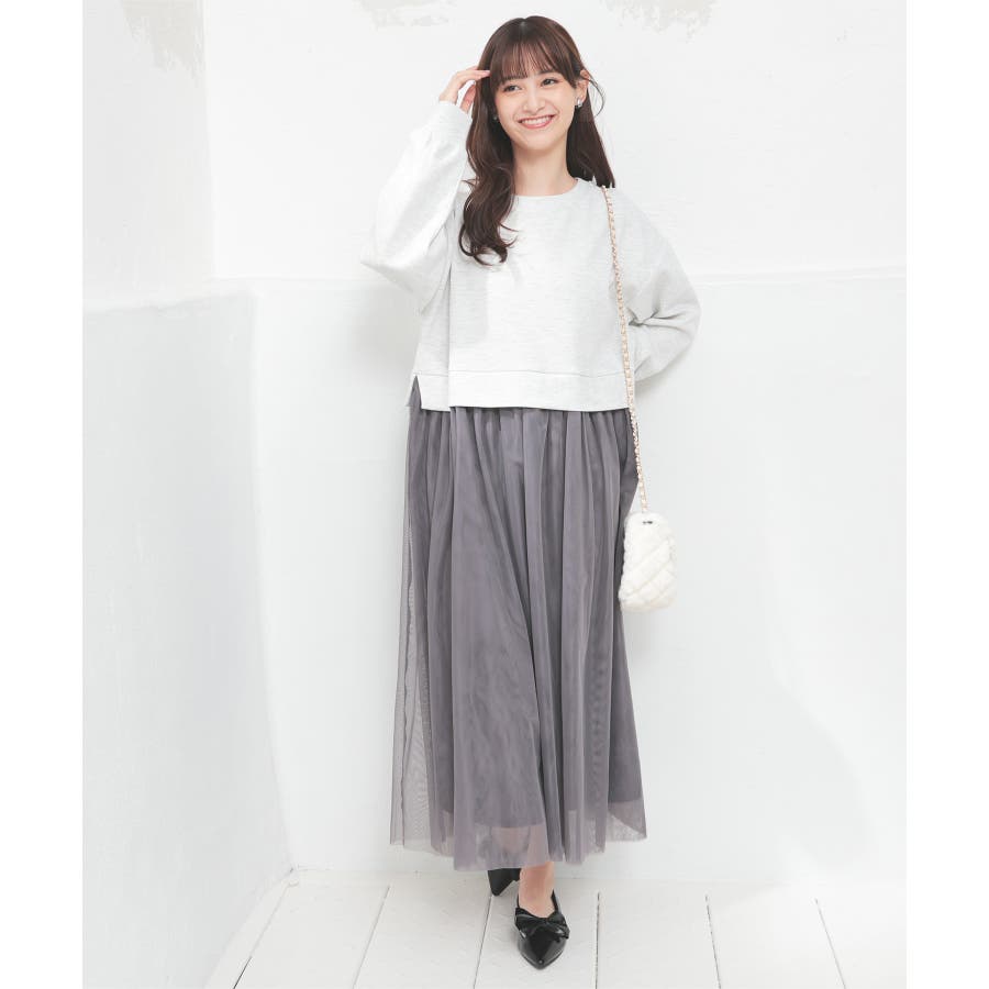 スウェットトップスにふんわりとしたチュールスカートをドッキングした、簡単におしゃれ見えが叶うデザイン。