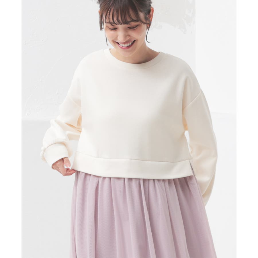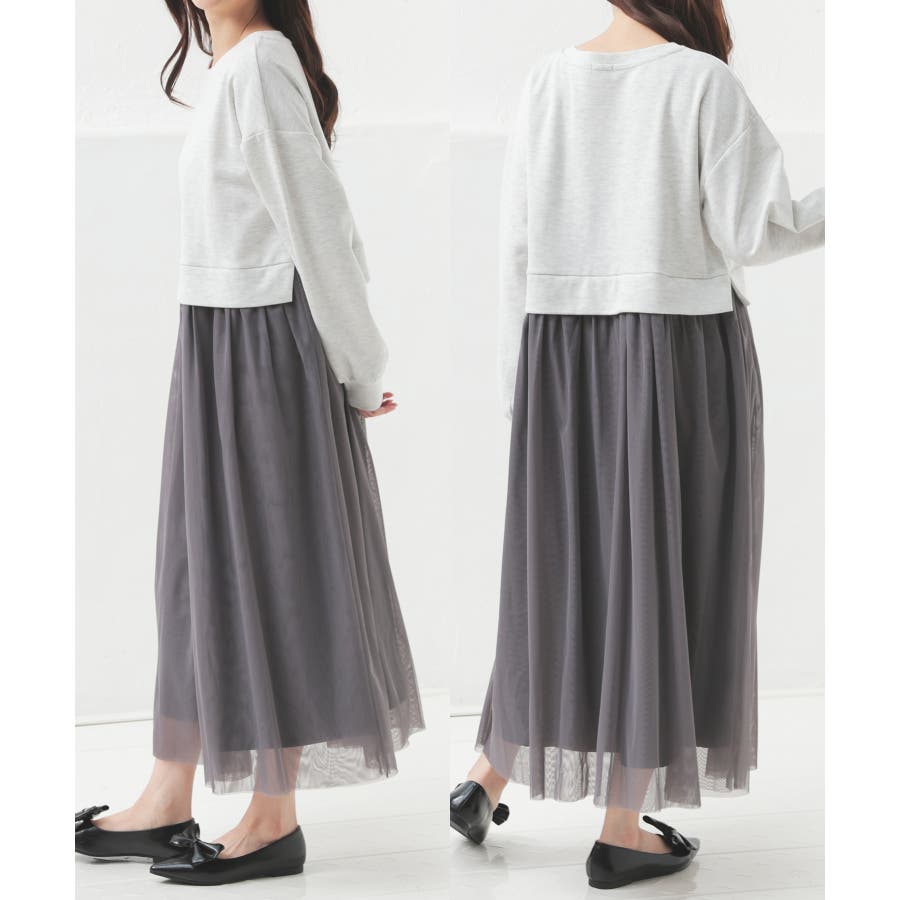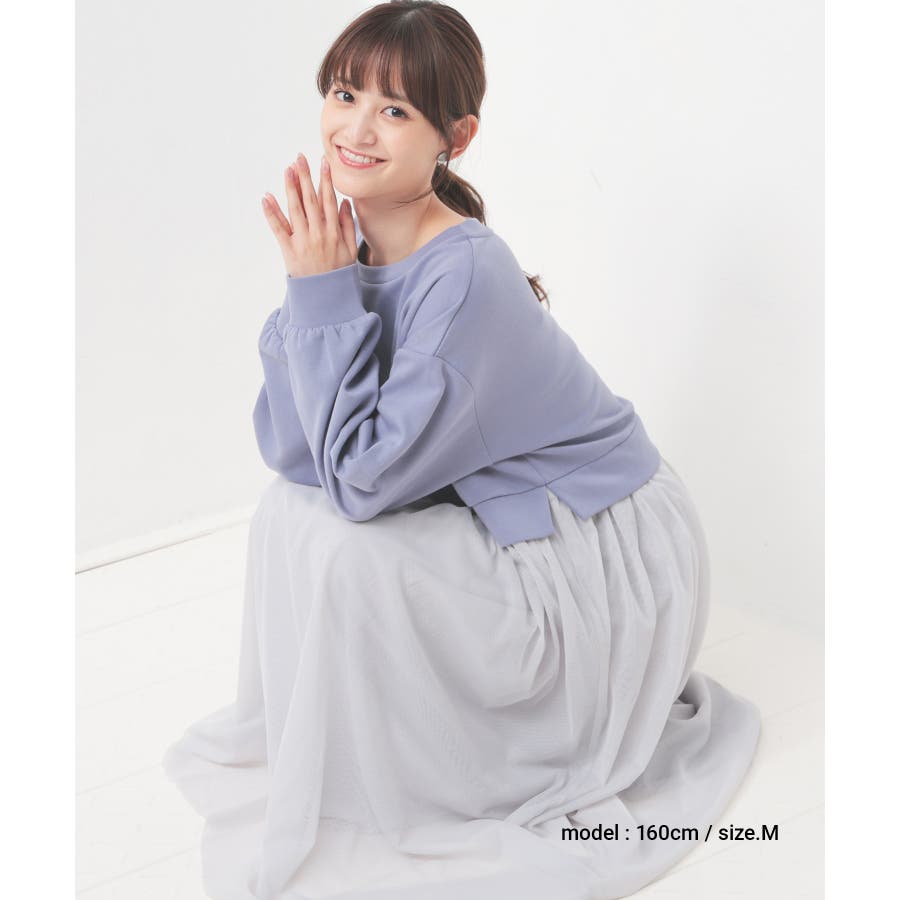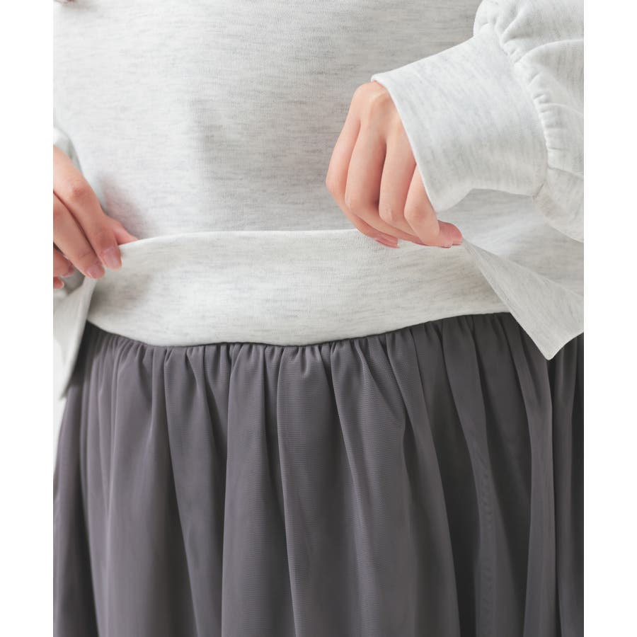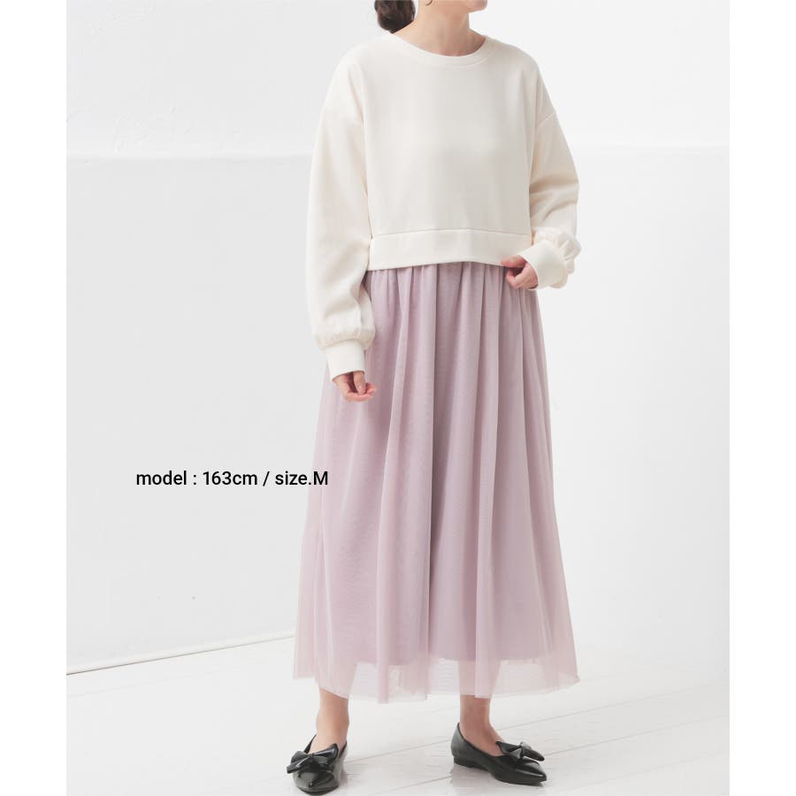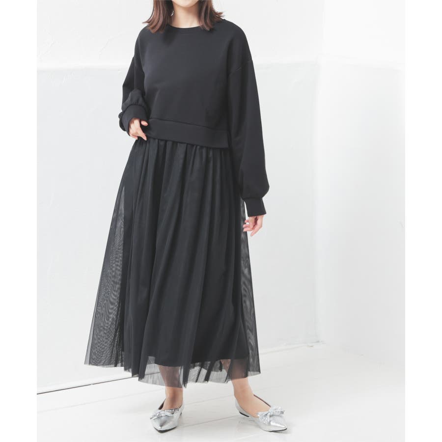 スウェットトップスにふんわりとしたチュールスカートをドッキングした、簡単におしゃれ見えが叶うデザイン。