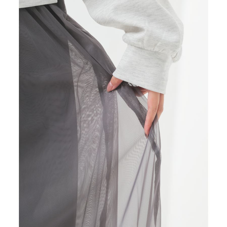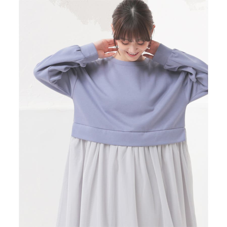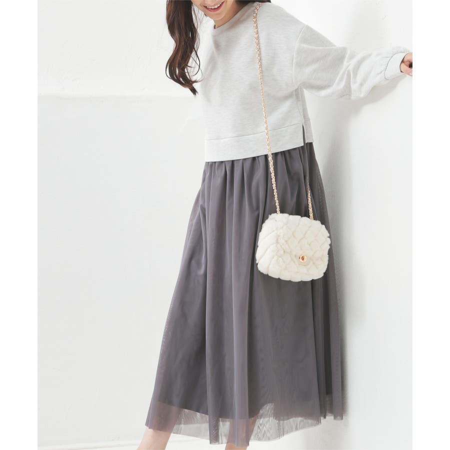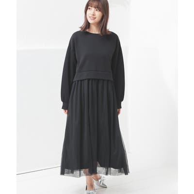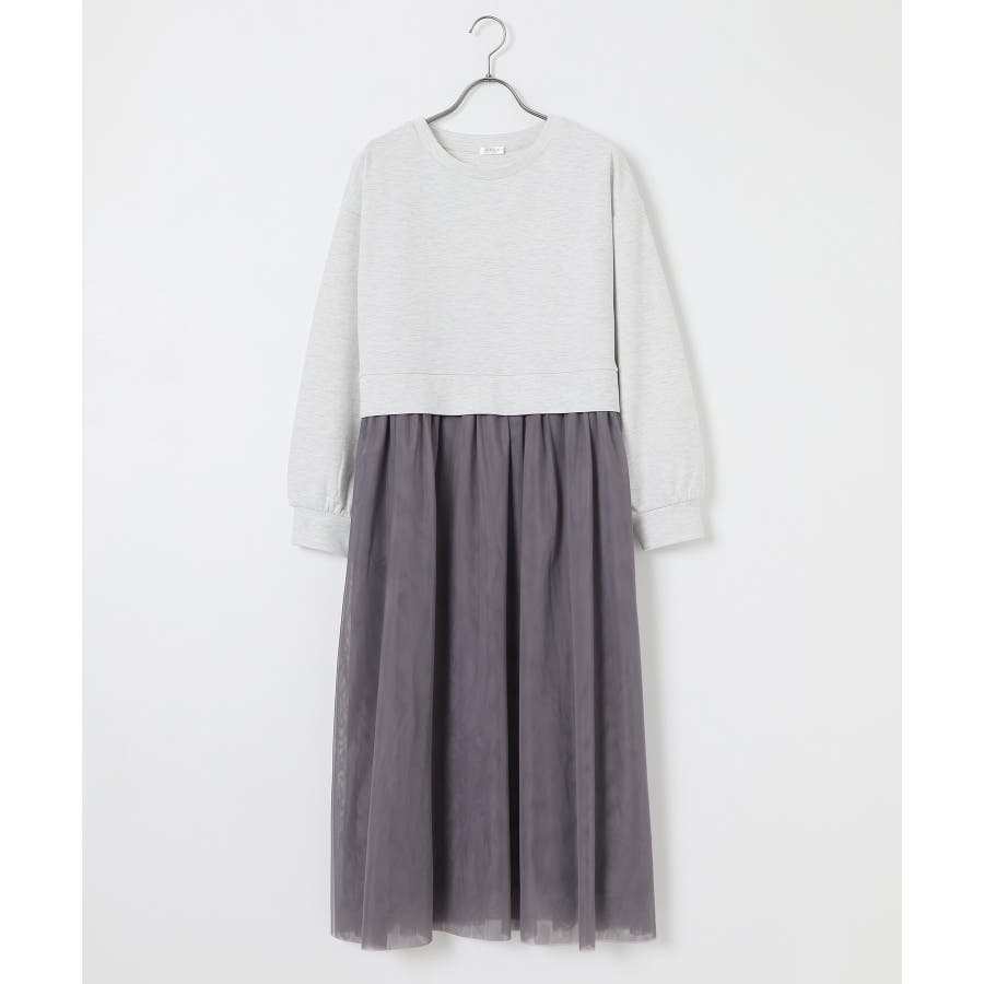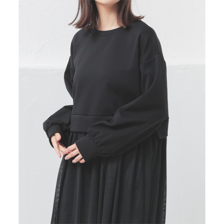 スウェットトップスにふんわりとしたチュールスカートをドッキングした、簡単におしゃれ見えが叶うデザイン。