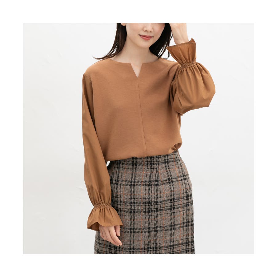 異素材切り替えのキャンディスリーブで、二の腕をカバーしつつ大人可愛さをプラス。