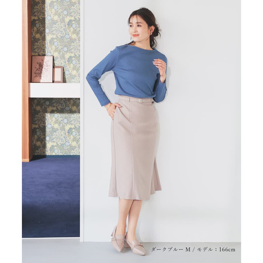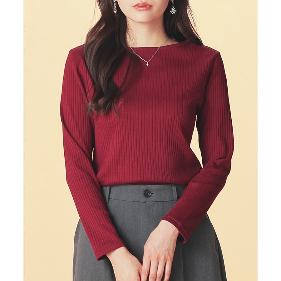 デコルテ部分の露出が少ないボートネックで、上品見えするシンプルデザイン。