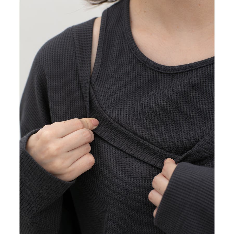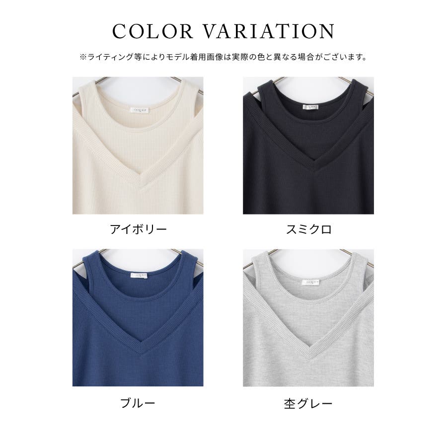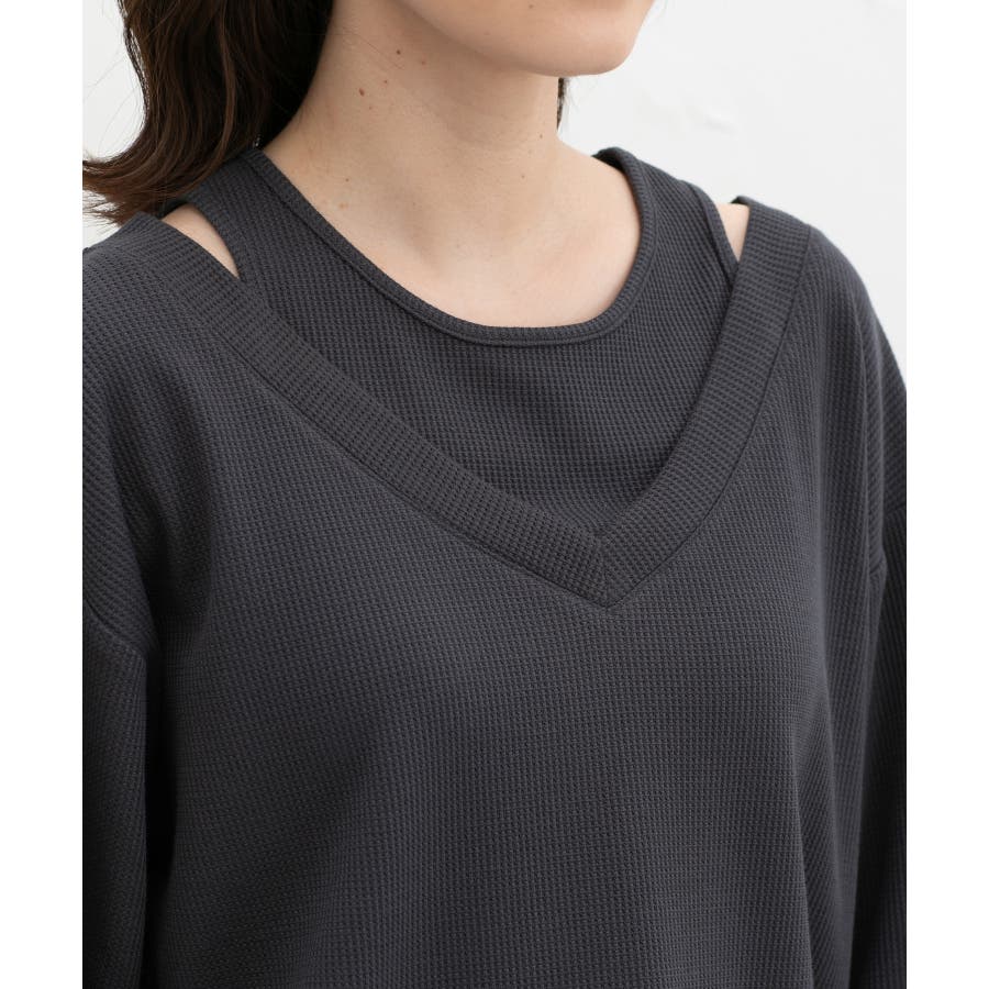 1枚で簡単にトレンドスタイルが完成する、Vネックトップス×タンクトップのフェイクレイヤードデザイン。