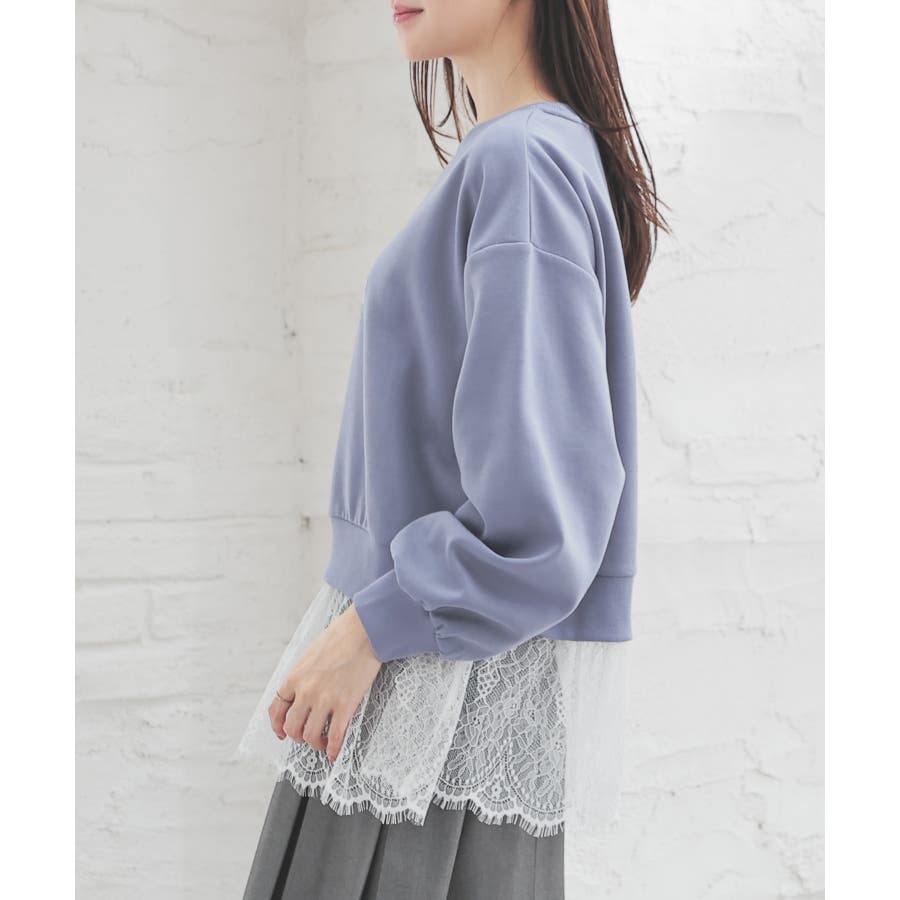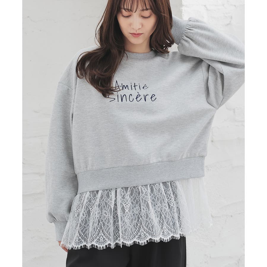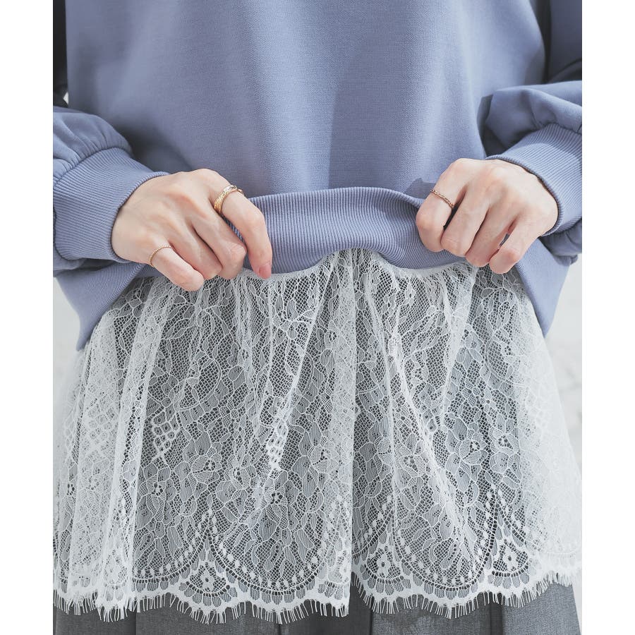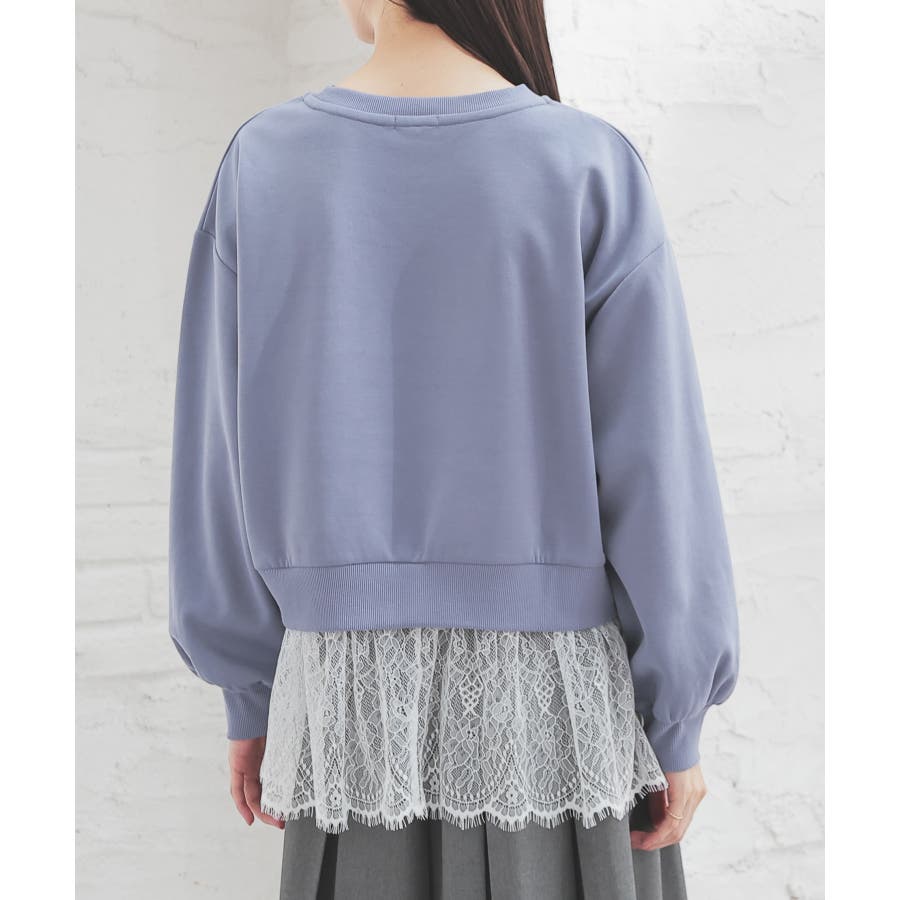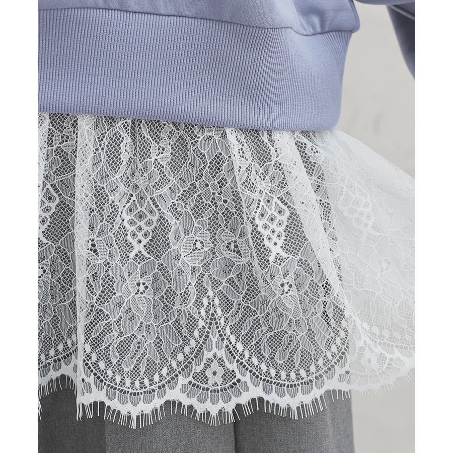 お洒落なロゴ入りトレーナーの裾にスカラップレースを付けた、1枚で簡単にトレンドのレイヤード風スタイルが完成するデザイン。
