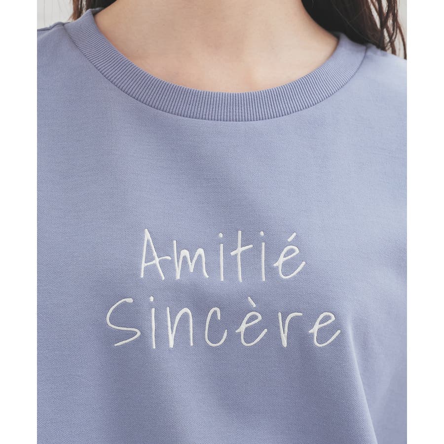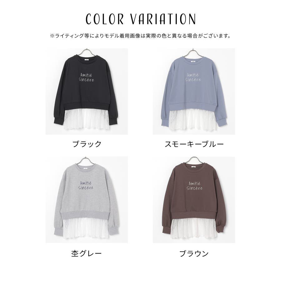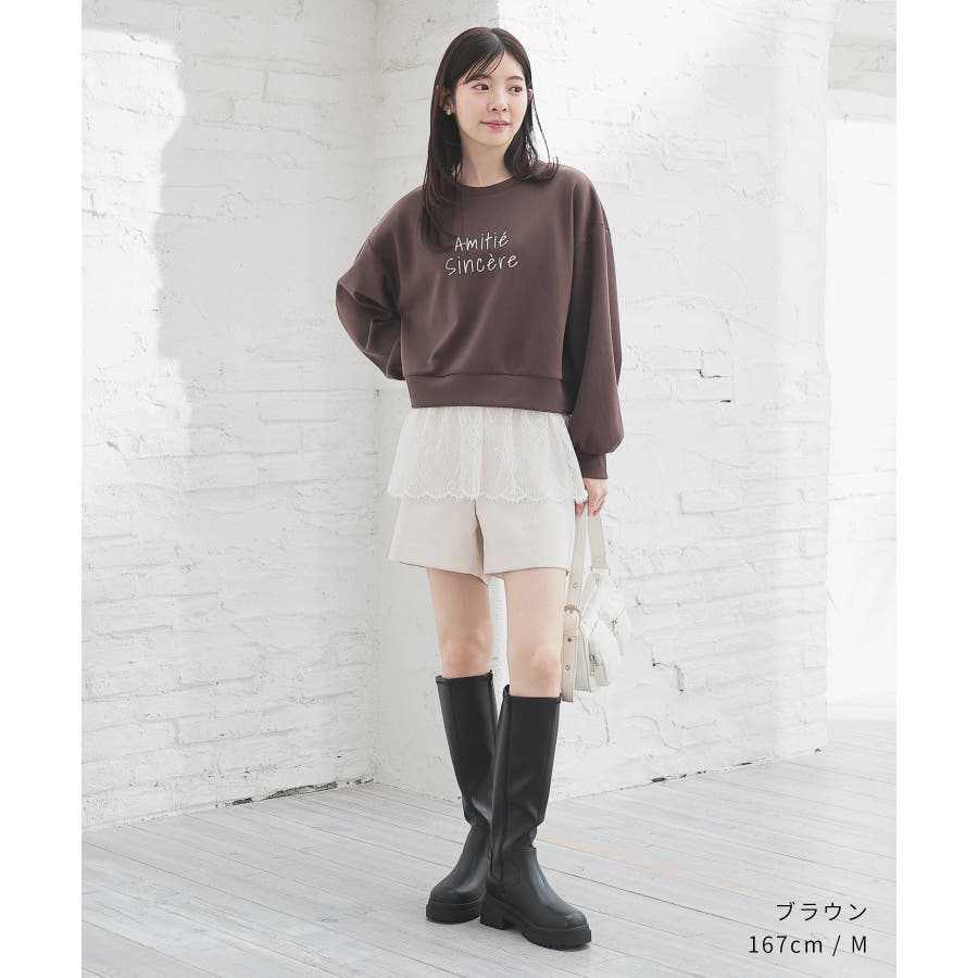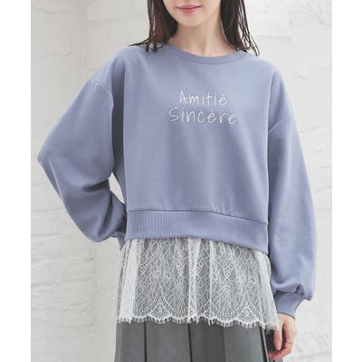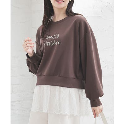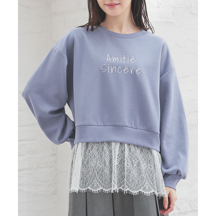 お洒落なロゴ入りトレーナーの裾にスカラップレースを付けた、1枚で簡単にトレンドのレイヤード風スタイルが完成するデザイン。