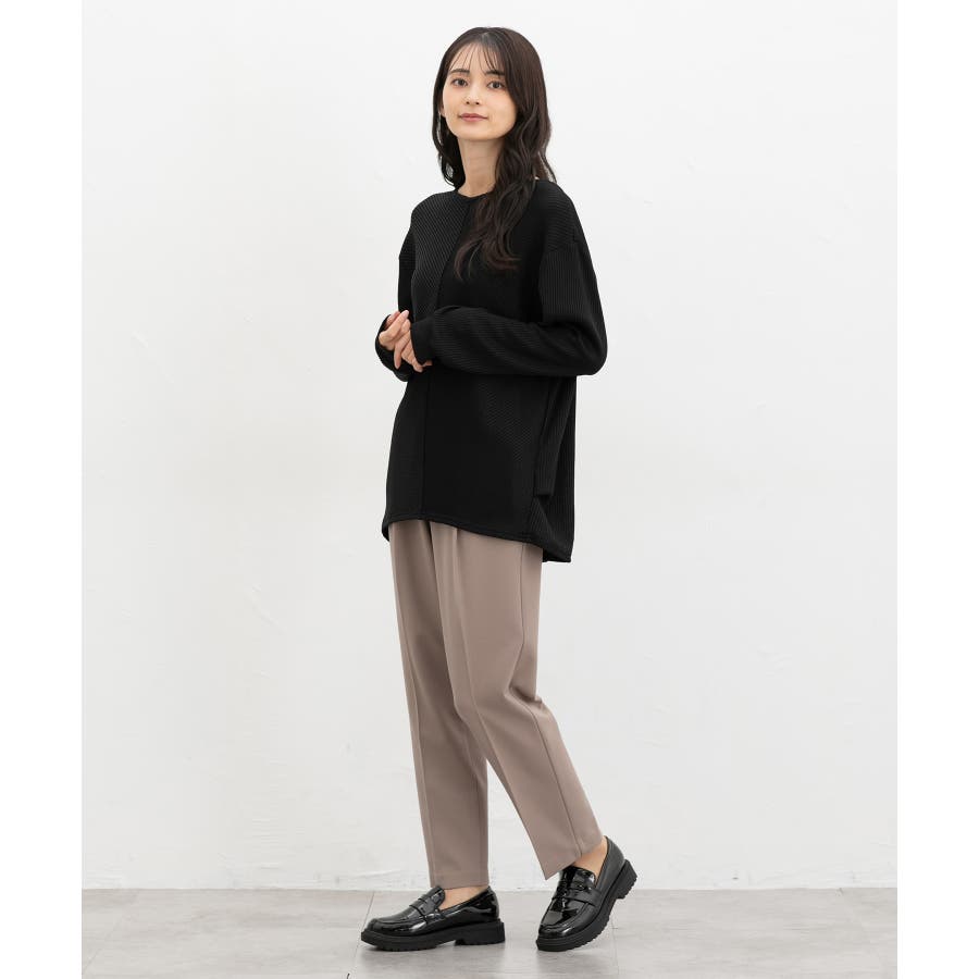 タックを入れてやや前側に切り替えたサイドラインと前後差ヘムで、立体感のあるこなれシルエット。