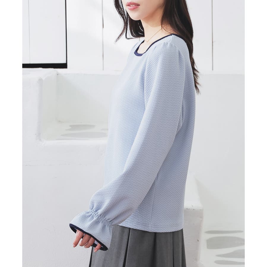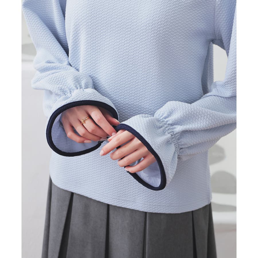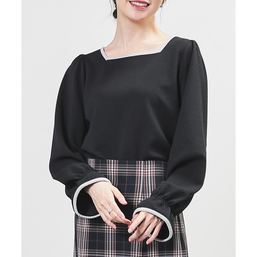 衿ぐりと袖口の配色パイピングとふんわりキャンディスリーブが上品な雰囲気のデザイン。