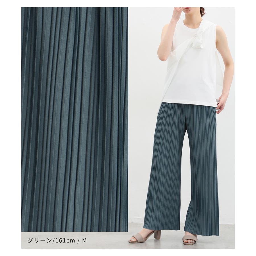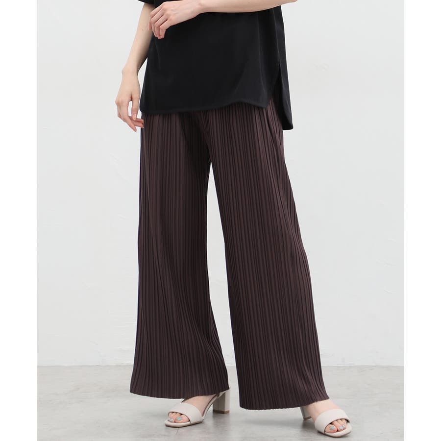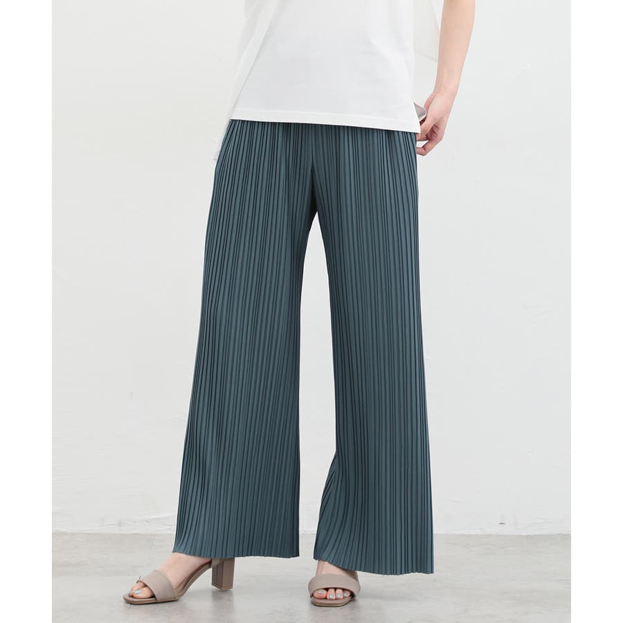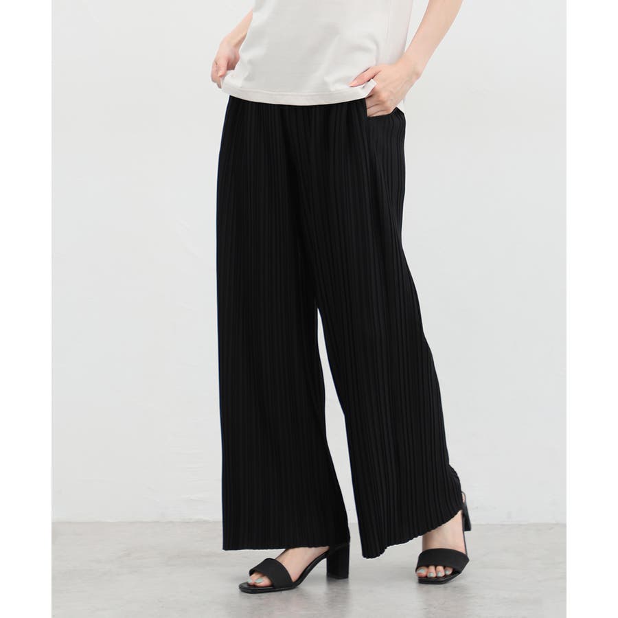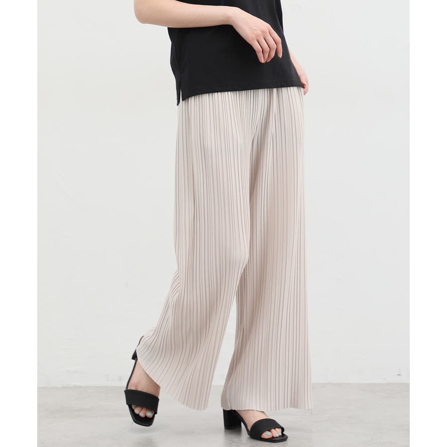 プリーツの縦ラインとストレートなシルエットで、レッグラインを拾わず美脚効果抜群のデザイン。