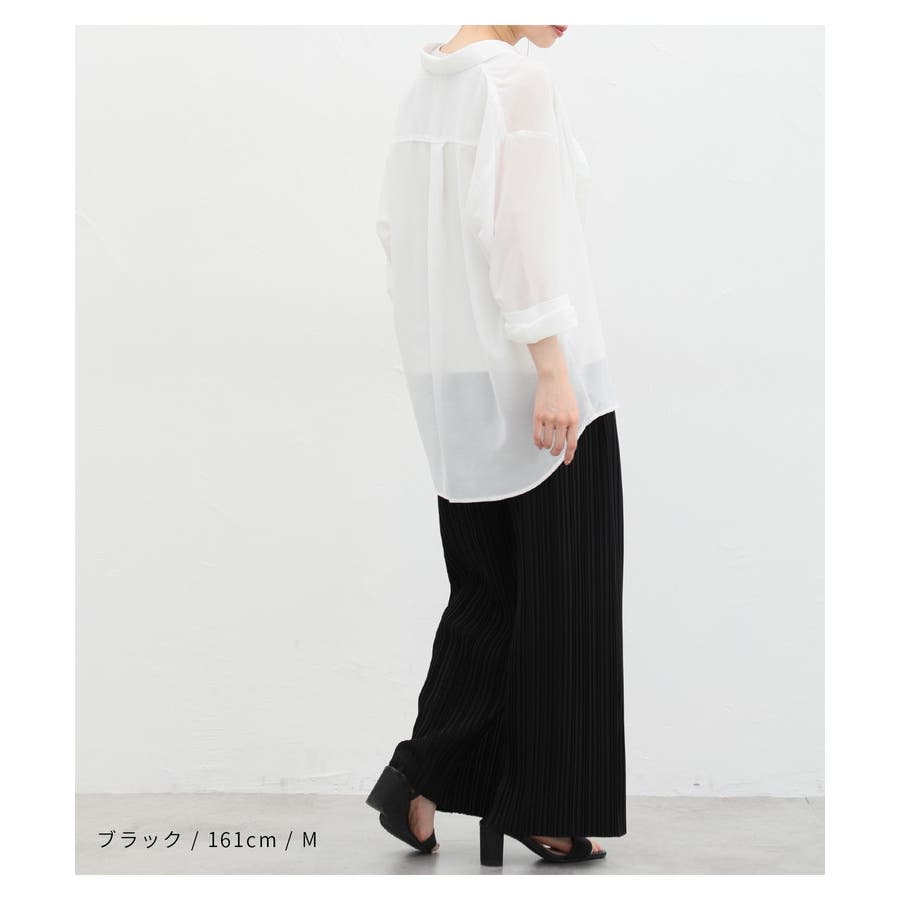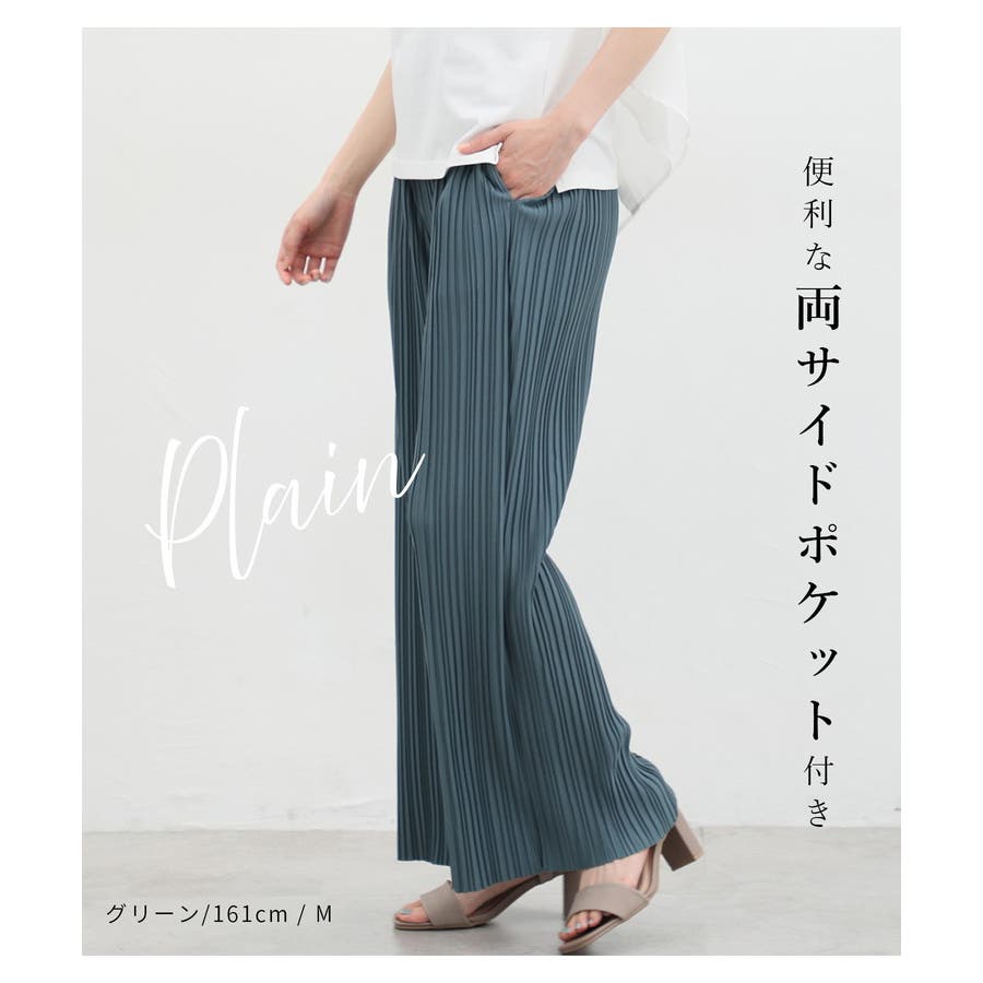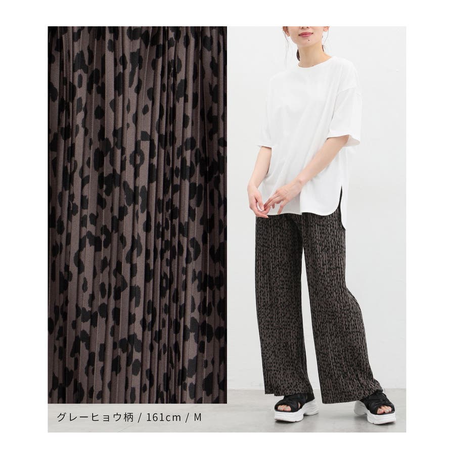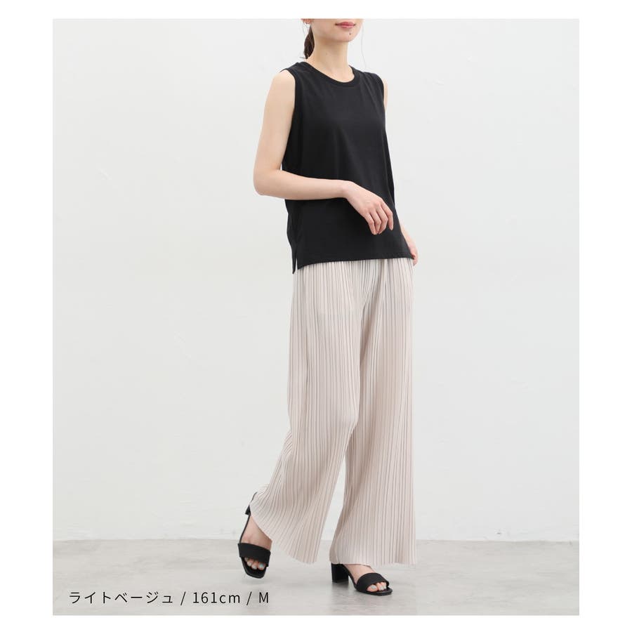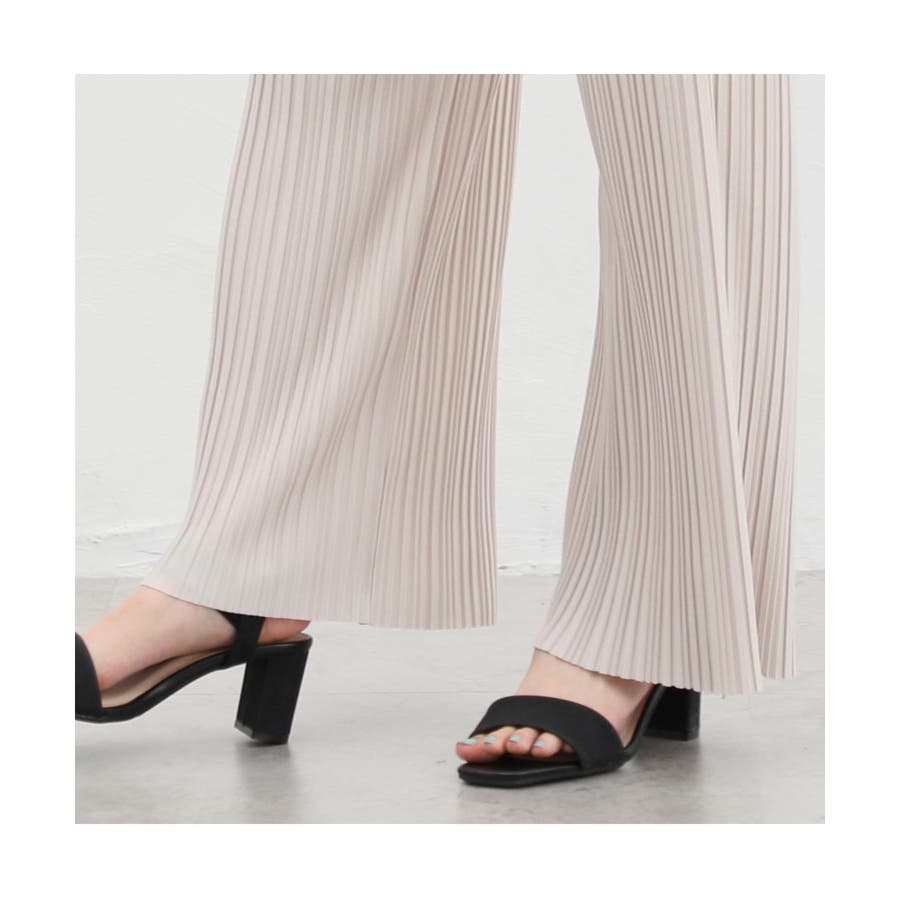 プリーツの縦ラインとストレートなシルエットで、レッグラインを拾わず美脚効果抜群のデザイン。