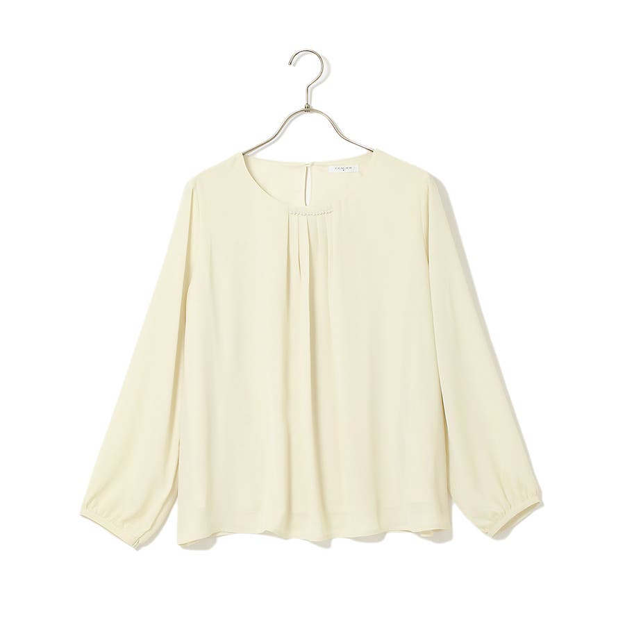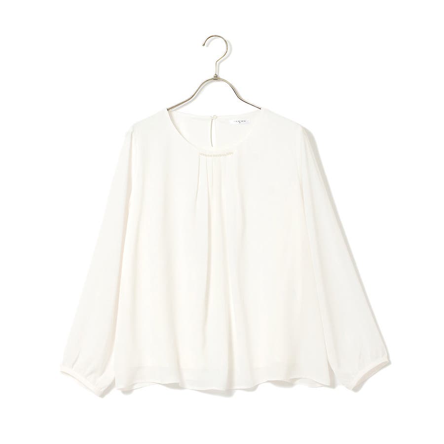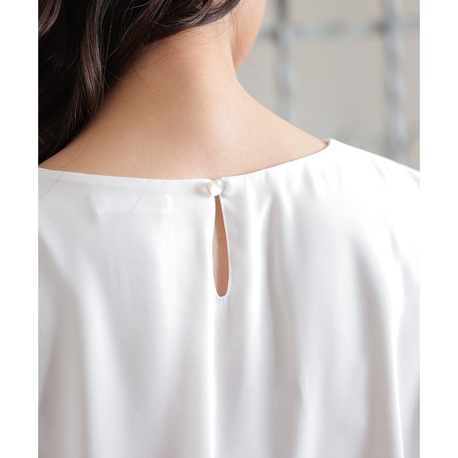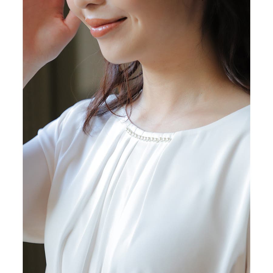 衿元のパールビーズとフロントタックデザインが上品なトップス。