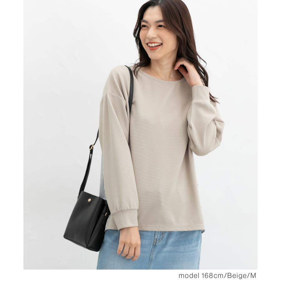 ドロップショルダーのゆったりシルエットとヒップまですっぽり隠れる丈感で体型をカバー。
