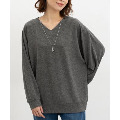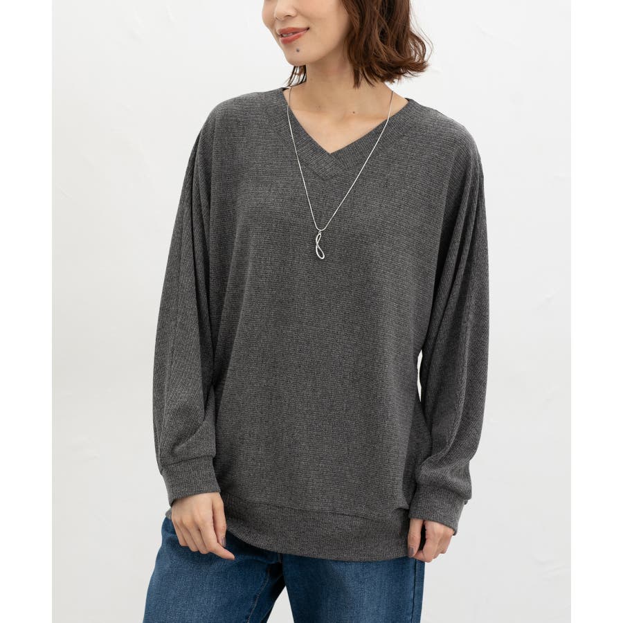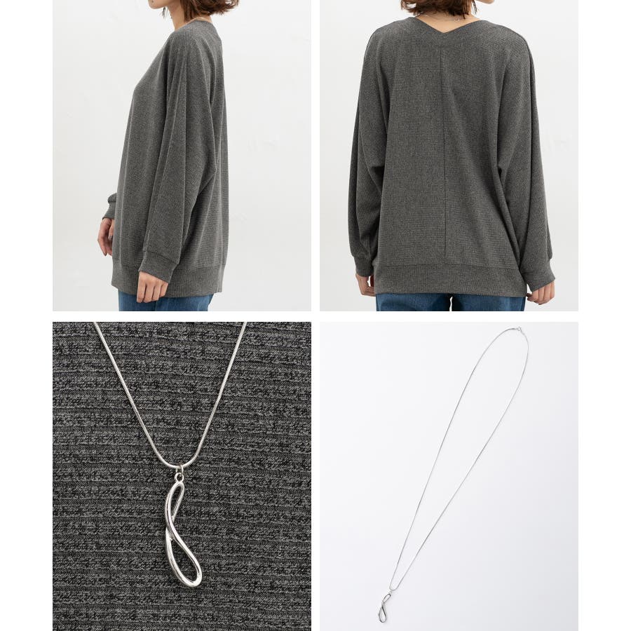 デコルテがきれいに見えるVネックのシンプルデザインに映えるアクセサリー付き。