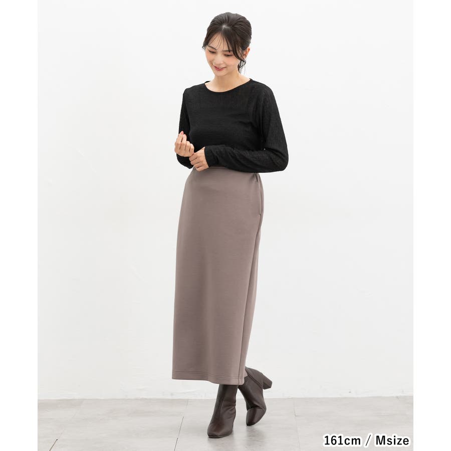 ボディーに程よくフィットする、すっきりめの幅と腰にかかる丈感。