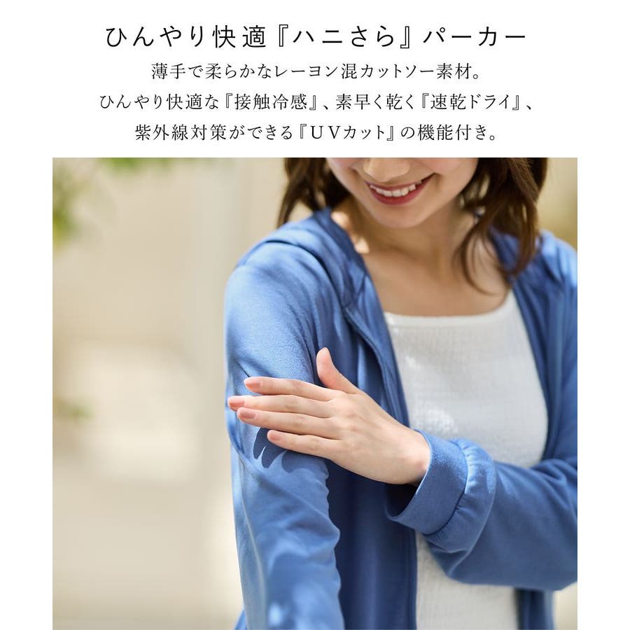 ひんやり快適な『接触冷感』と、素早く乾く『速乾ドライ』、紫外線対策ができる『UVカット』の機能が付いた『ハニさら』アイテム。