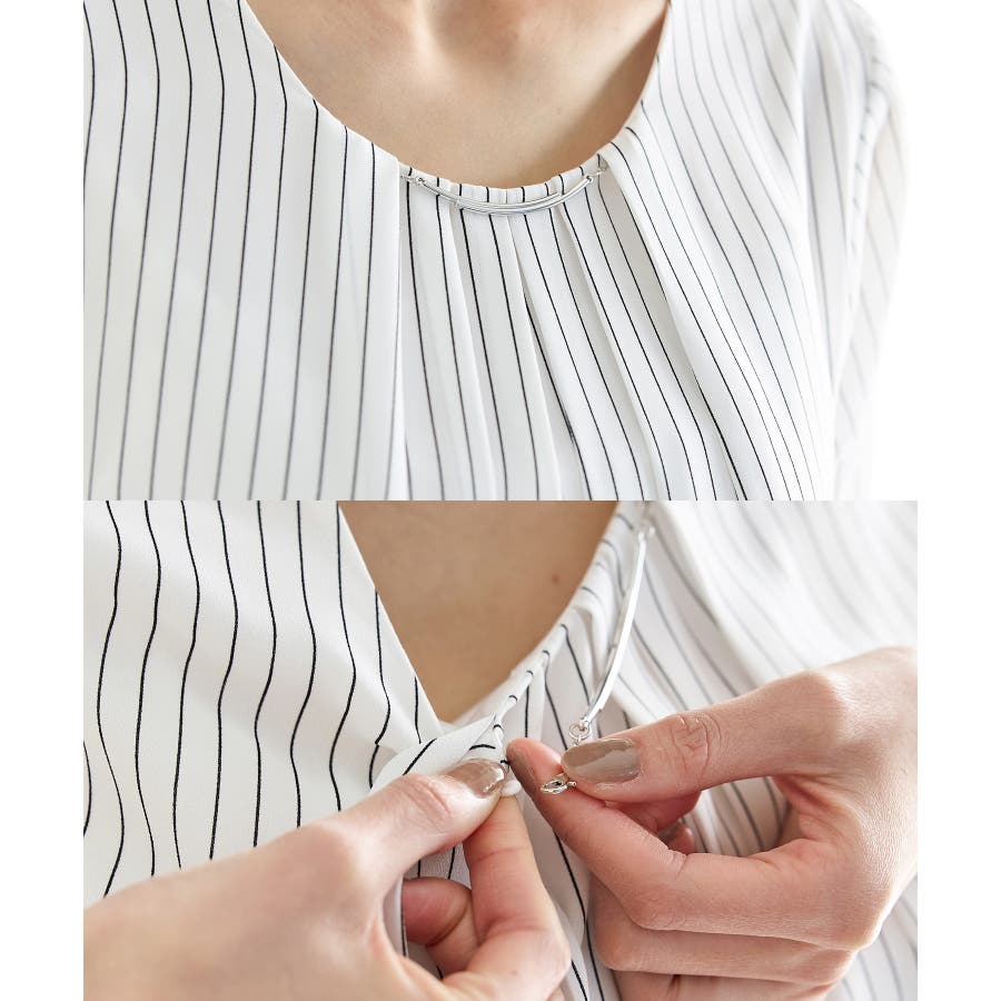 衿元にさりげない華やかさをプラスするメタルパーツのアクセサリーは、シーンやコーデに合わせて取り外し可能。