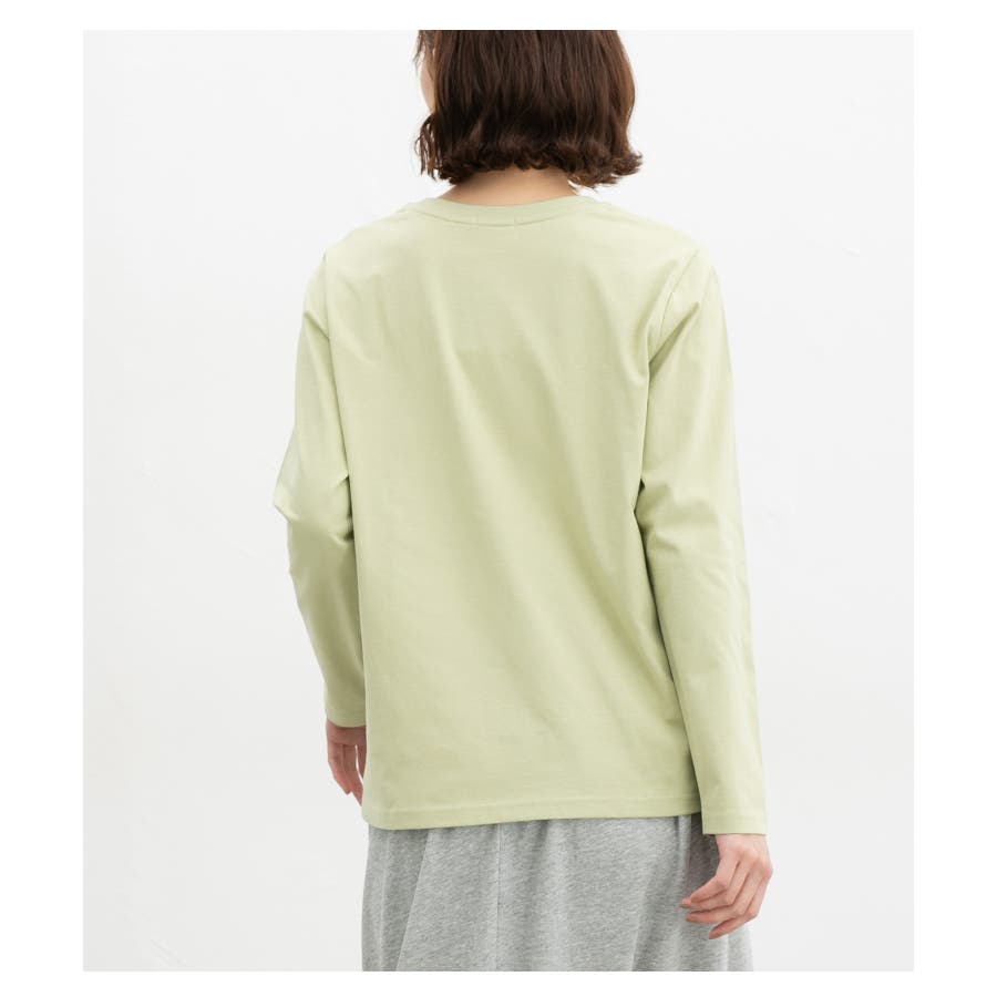 ベーシックなクルーネックで、ゆったりめの幅と腰回りが隠れる丈感。