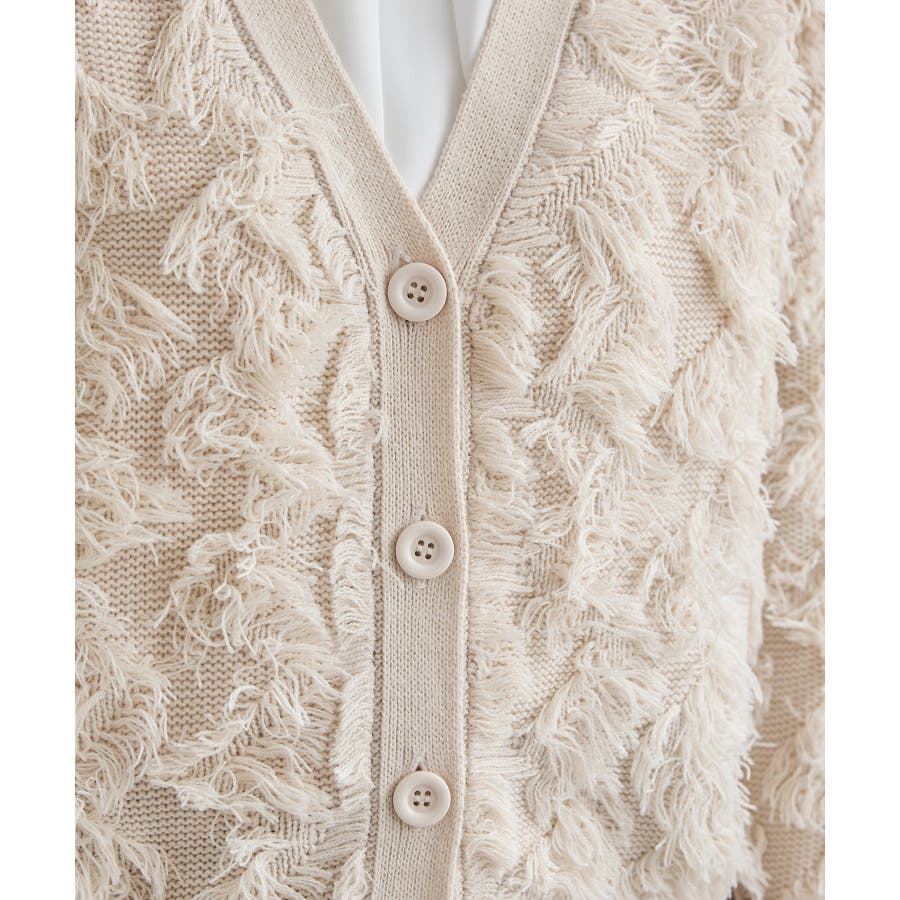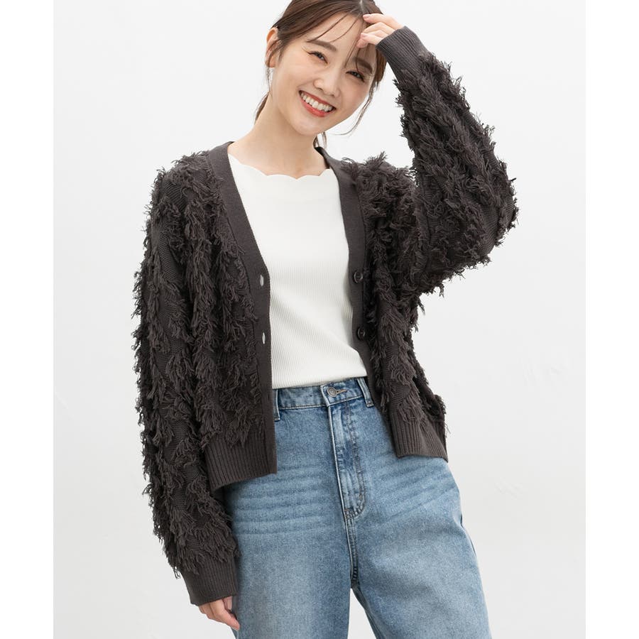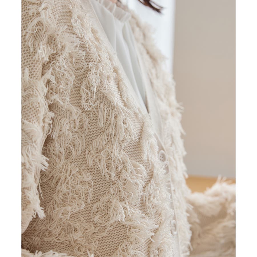 立体感のある柔らかな毛足のフリンジ編ニット素材。