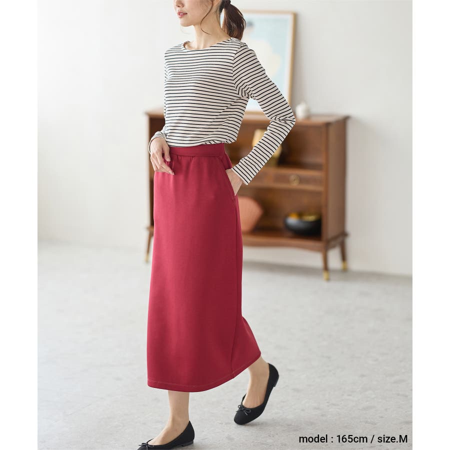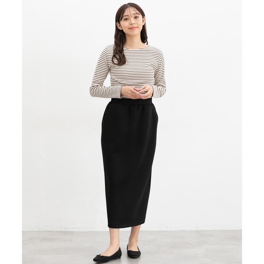 腰回りが隠れる丈感の、体にフィットするすっきりシルエットながら、動きに合わせて伸縮するフライス編みで快適な着心地。
