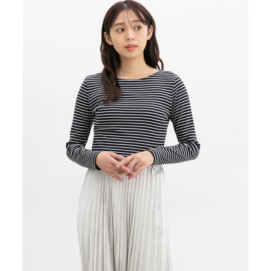 デコルテをきれいに見せる、開きすぎないボートネックのシンプルデザイン。