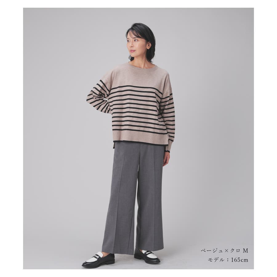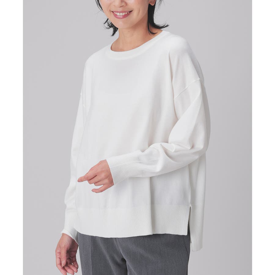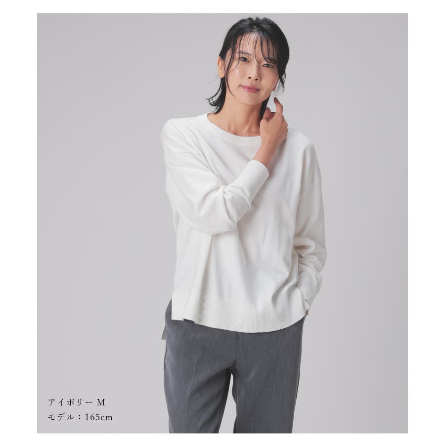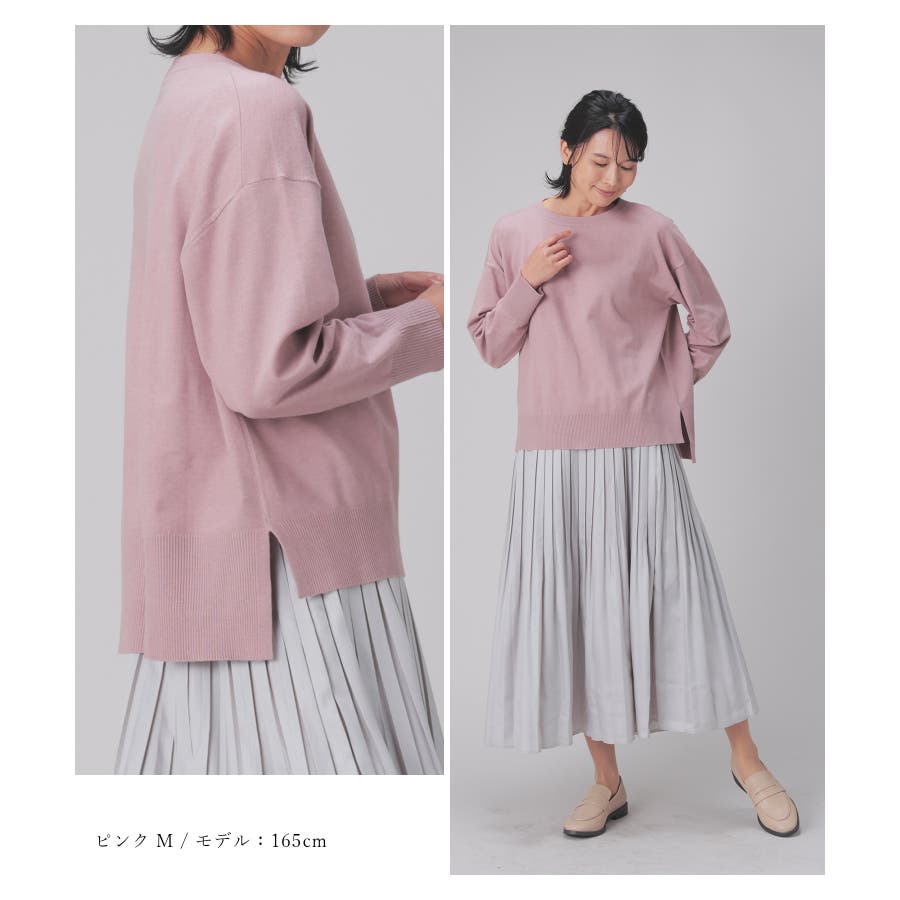 ゆったり幅と腰回りが隠れる丈感で体型をカバーしつつ、落ち感のある編地ですっきり見えも◎