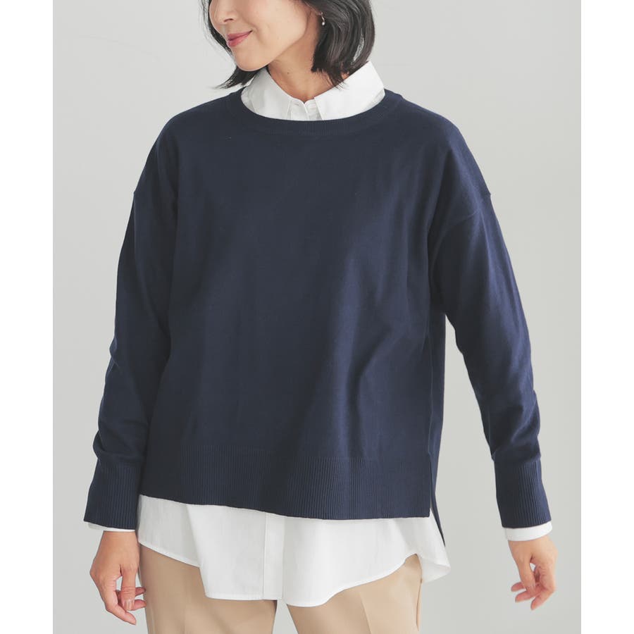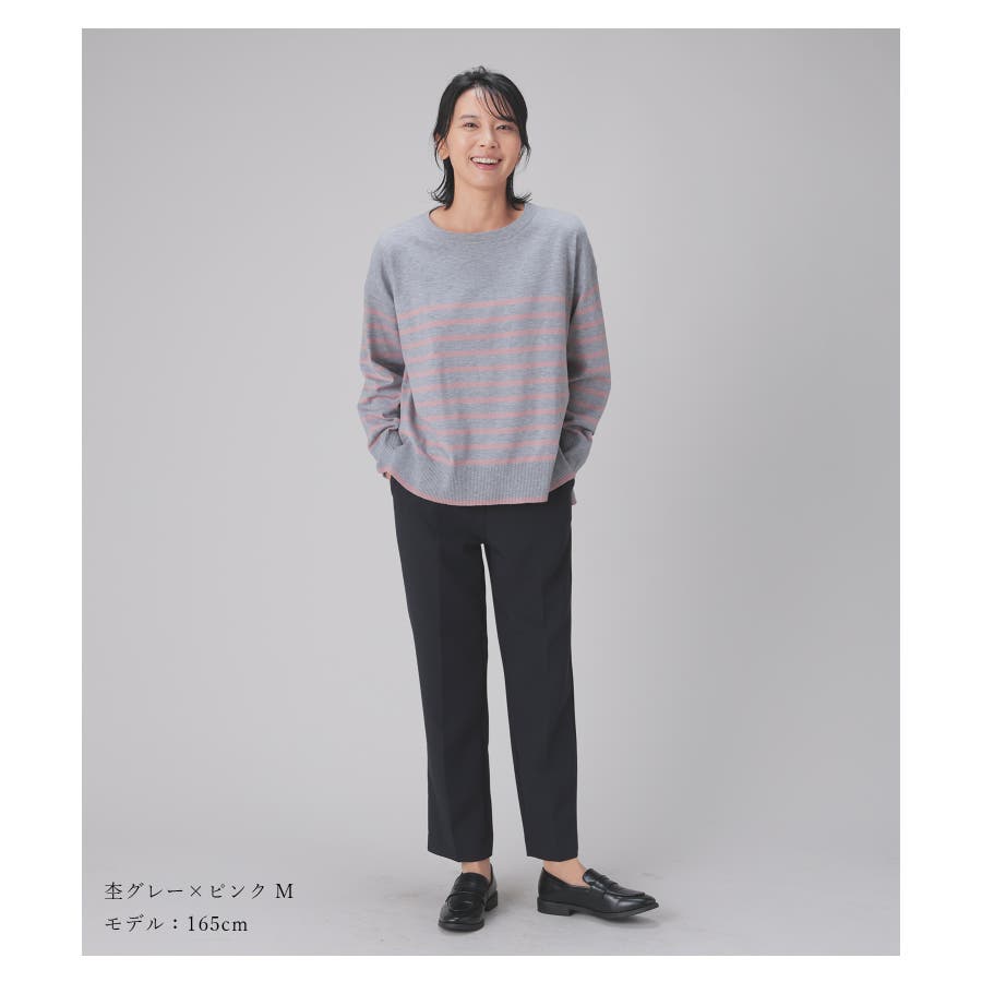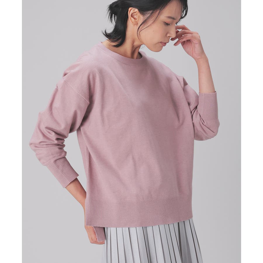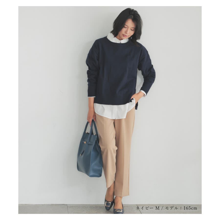 ゆったり幅と腰回りが隠れる丈感で体型をカバーしつつ、落ち感のある編地ですっきり見えも◎