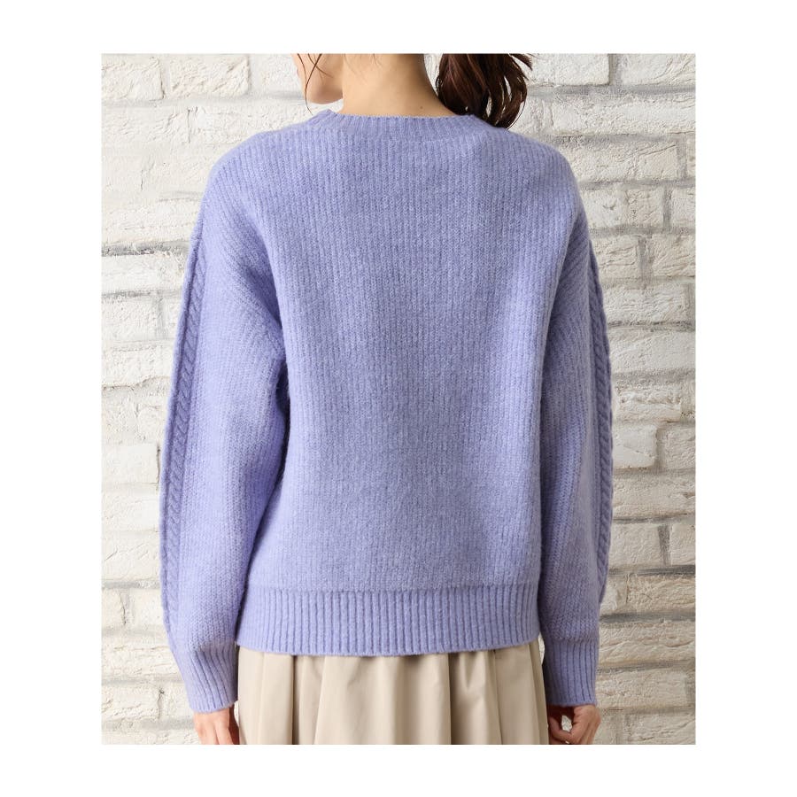 ベーシックなクルーネックに、前後で異なるケーブル&片畦編みが目を引く、大人可愛いデザイン。