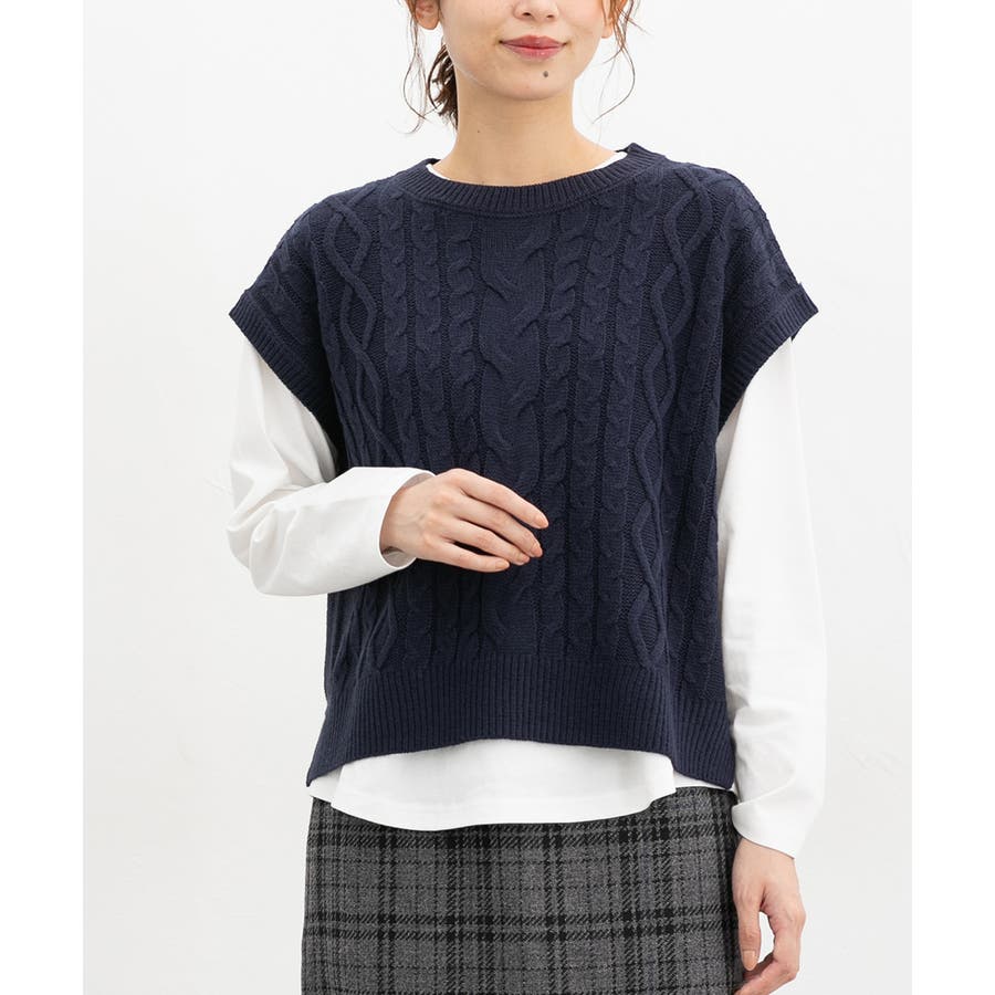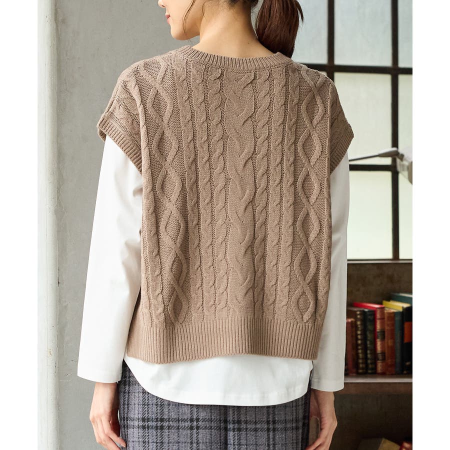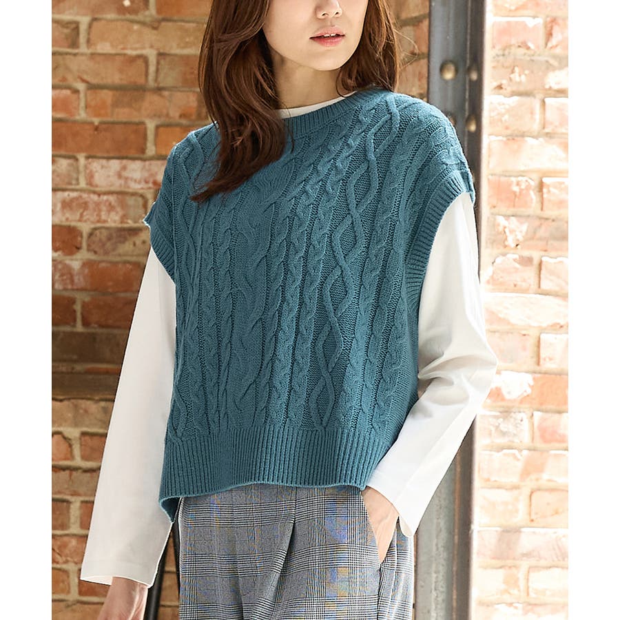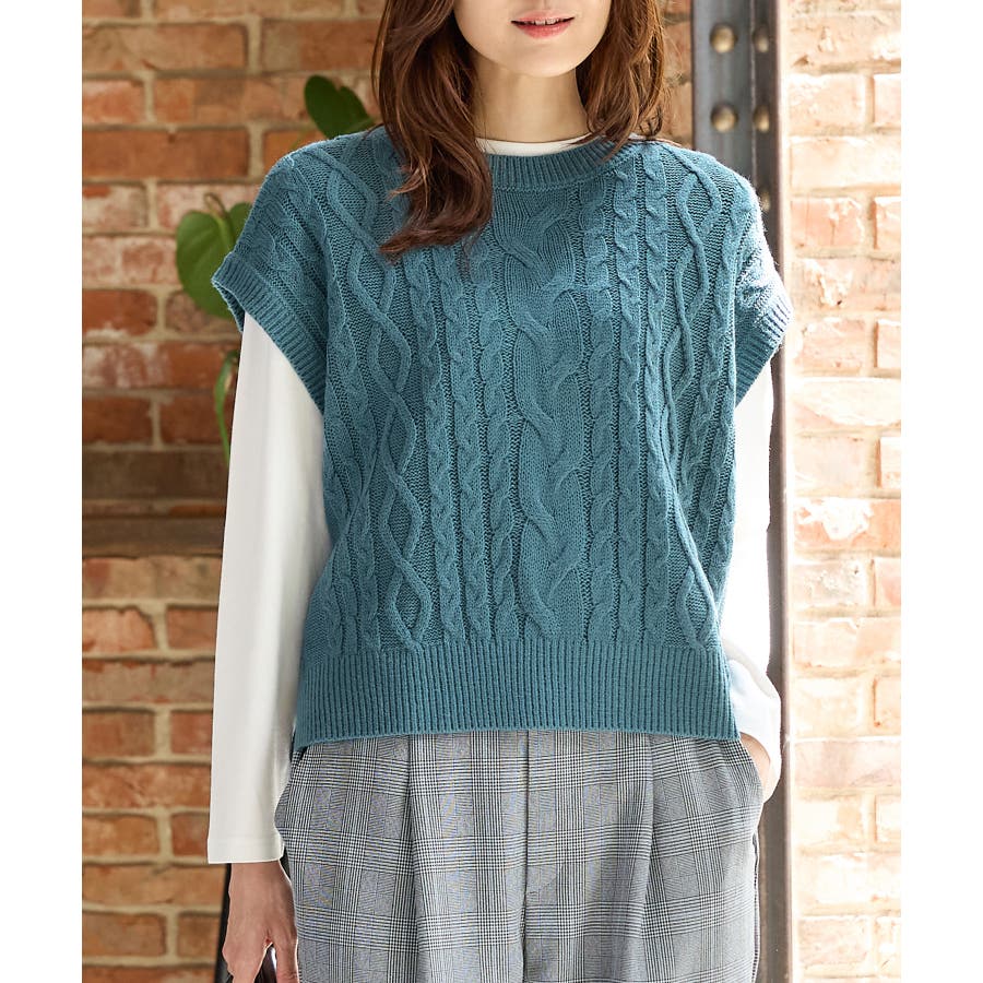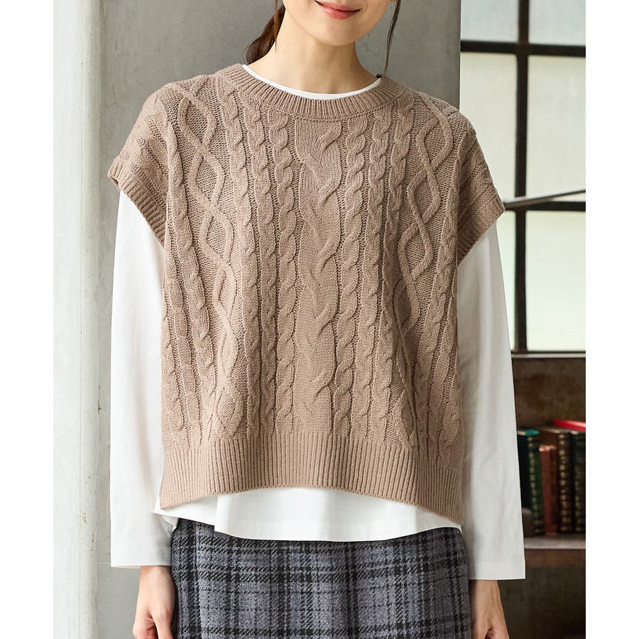 ニットベストは立体感が大人可愛いケーブル編みで、ゆったり幅×クロップド丈のトレンドライクなシルエット。