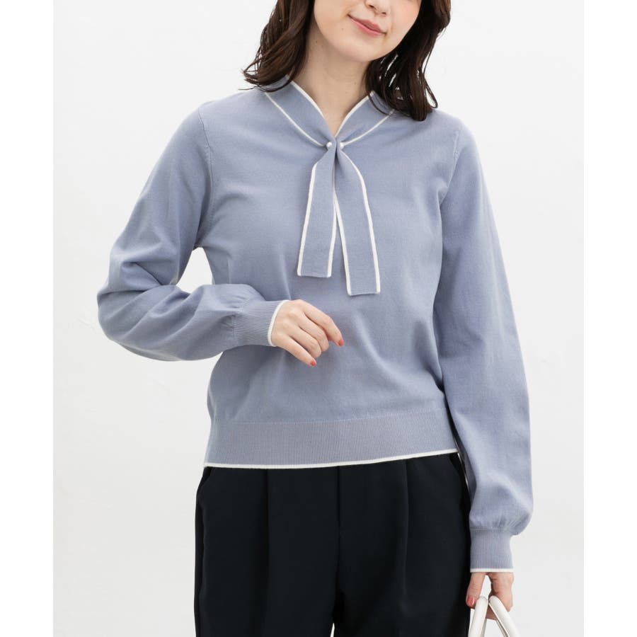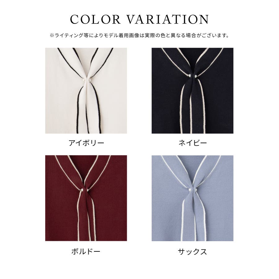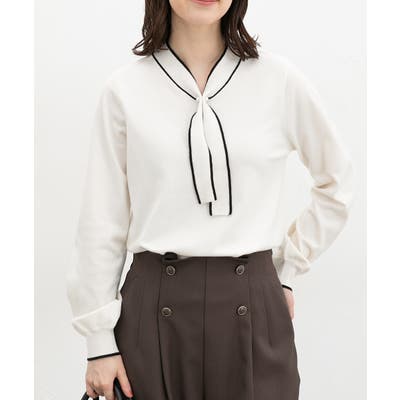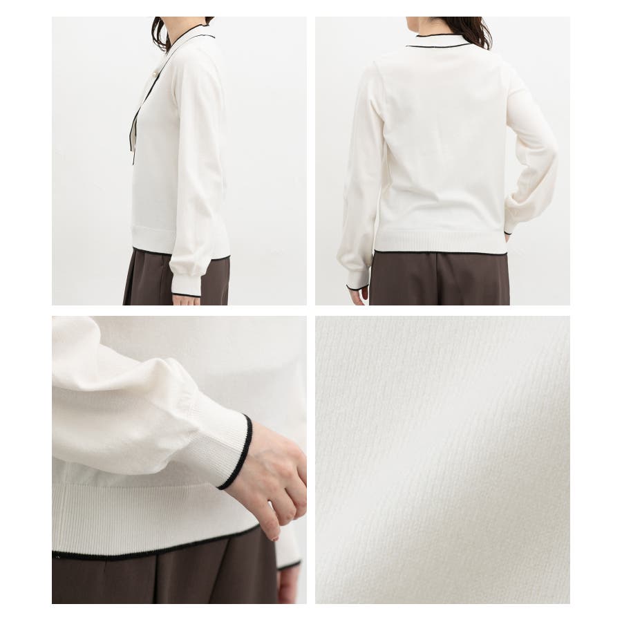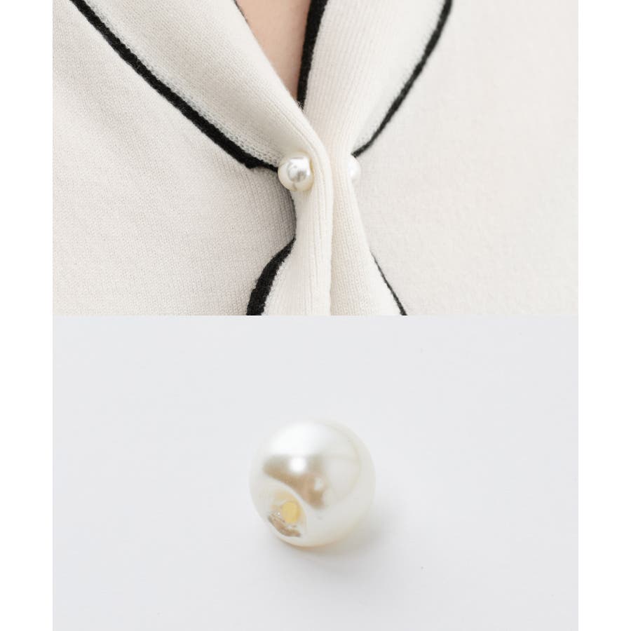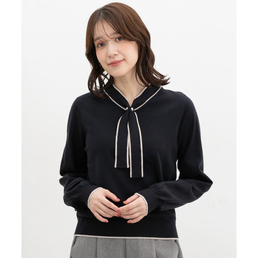 控えめなボウタイに付けたパールビーズ風の飾りボタンが、顔回りをさりげなく華やかに見せてくれるデザイン。