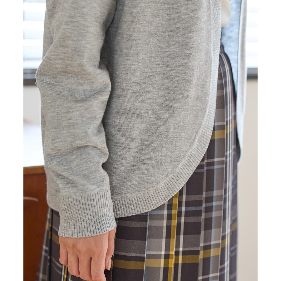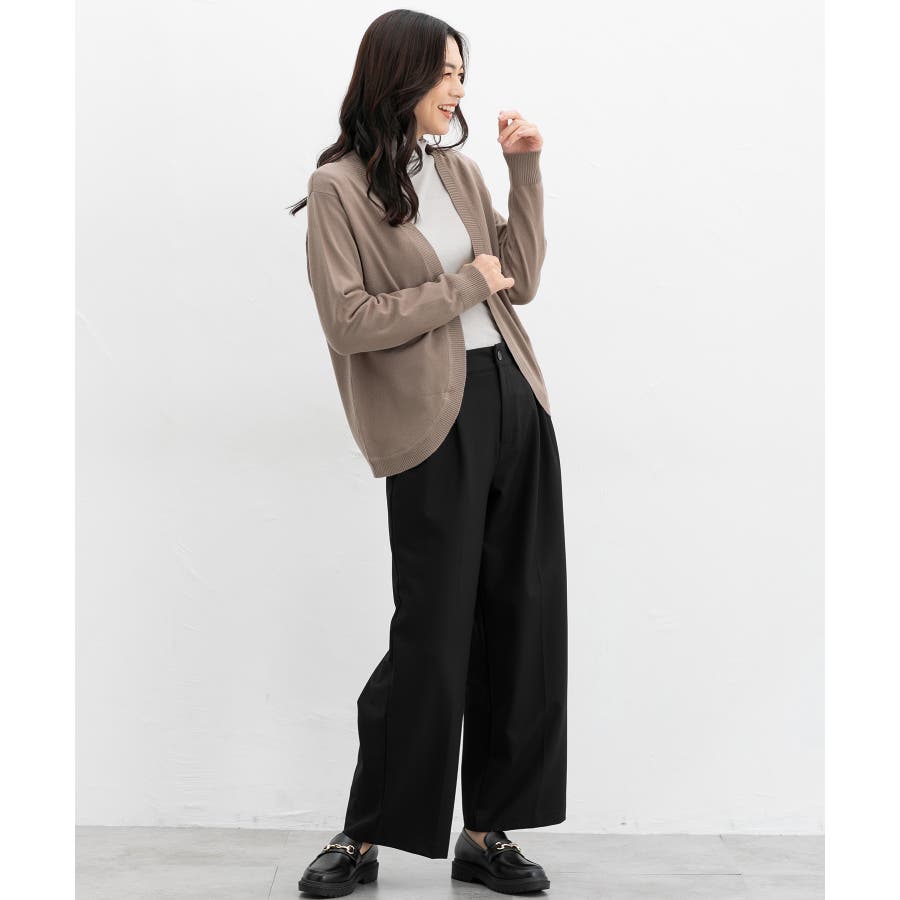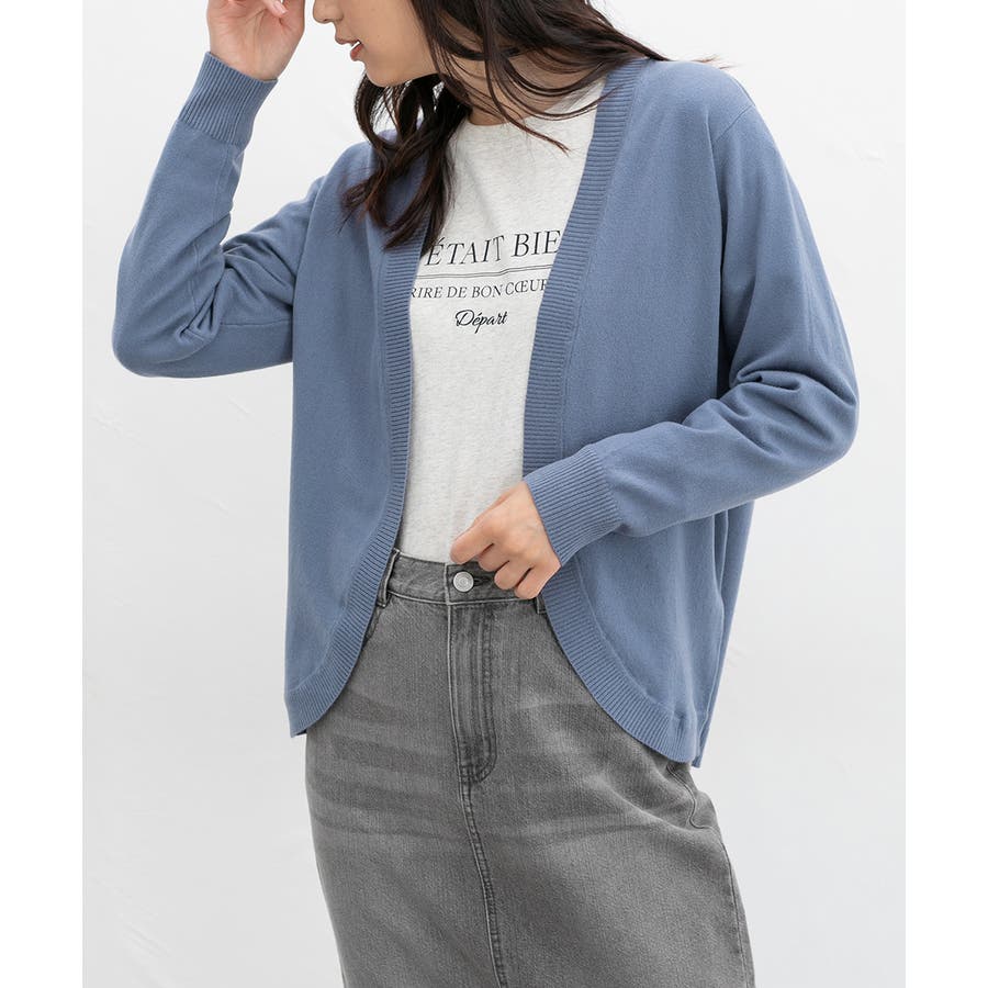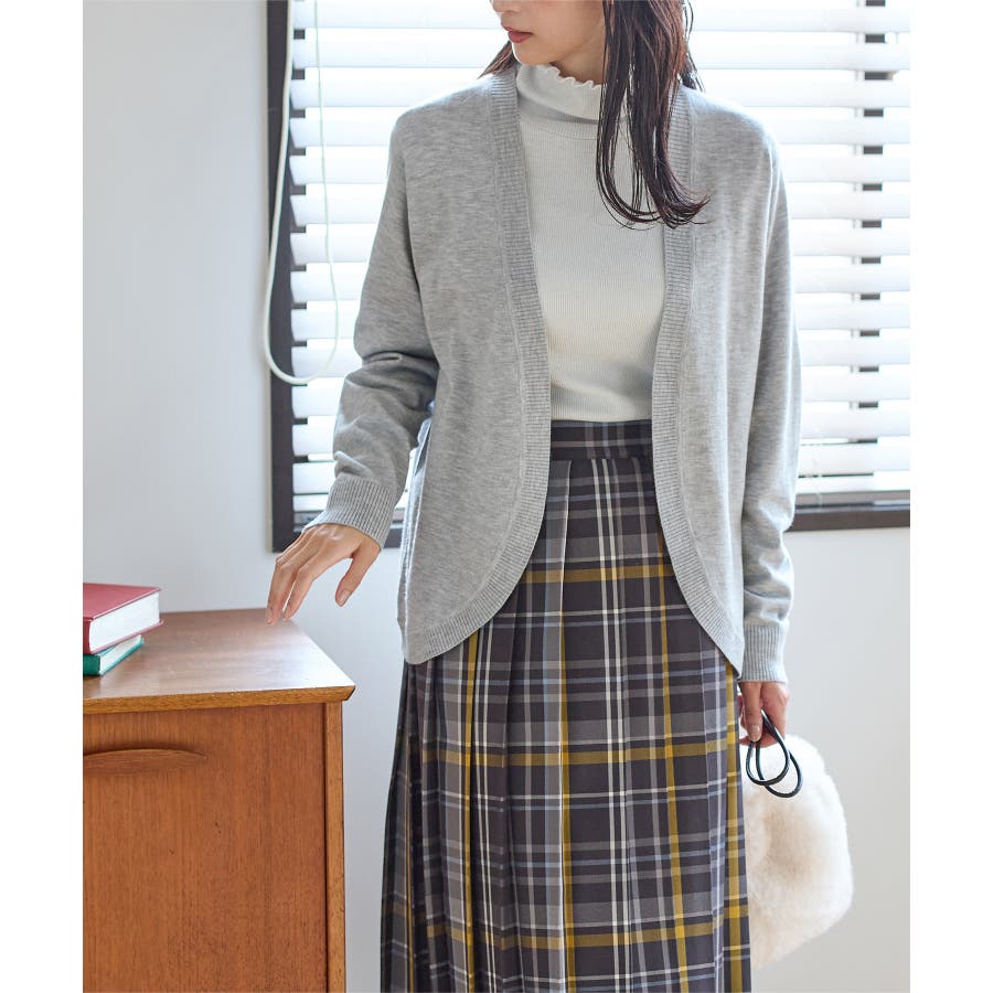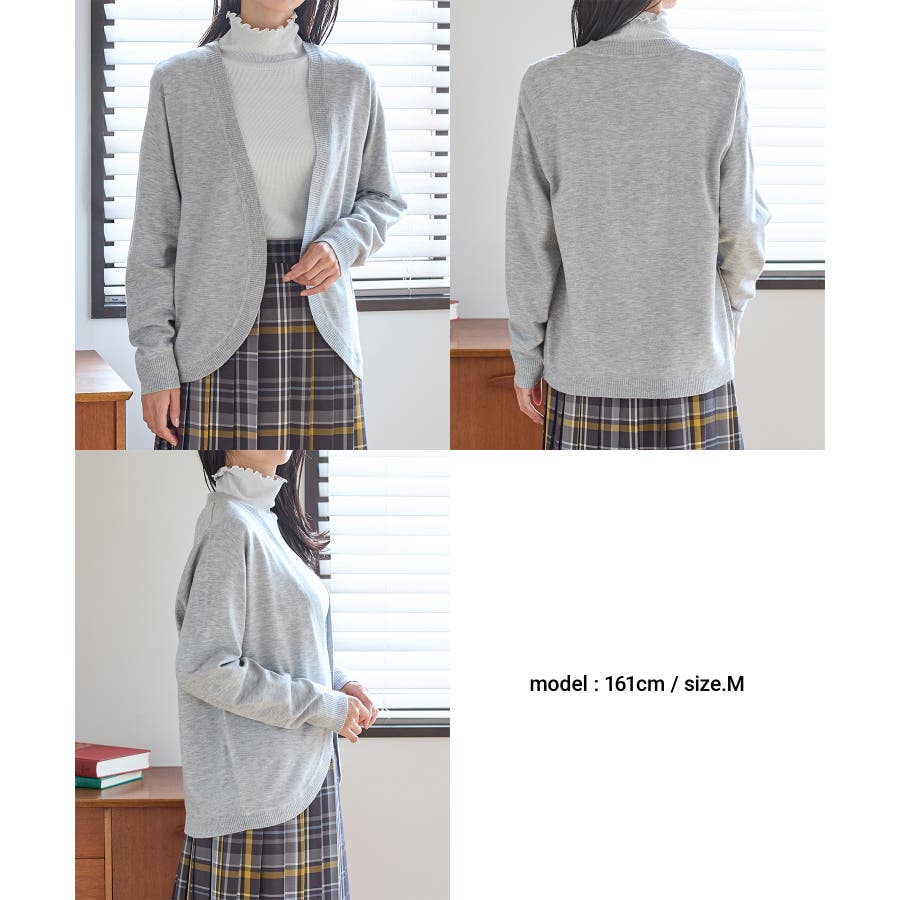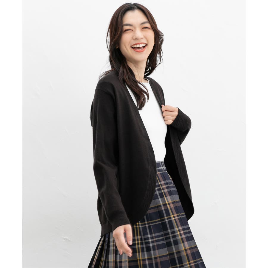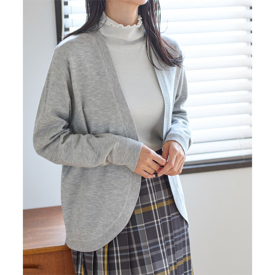 ラウンドした裾や丸みのあるシルエットがフェミニンな、手軽に羽織れるボタンレスデザイン。