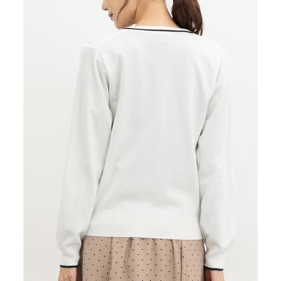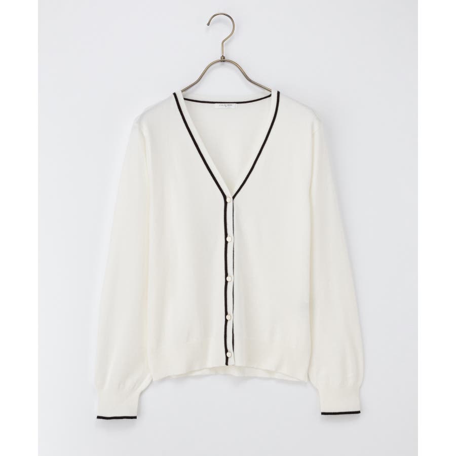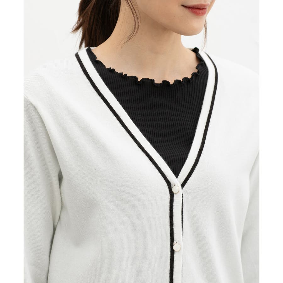 首元がすっきり見えるVネックの前立てと袖口に、細めの配色ラインがさりげないアクセント。