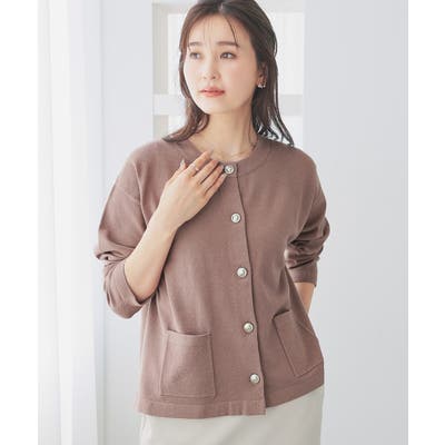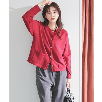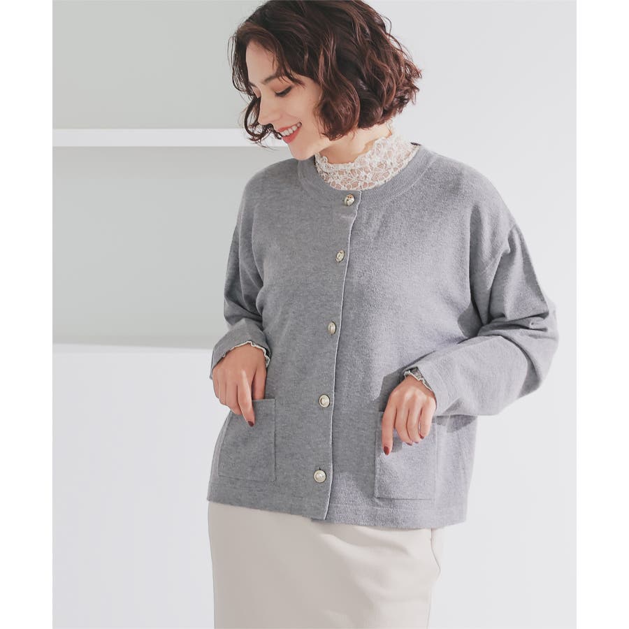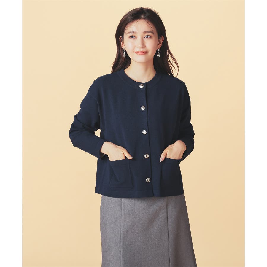 袖口や身頃を絞らない、ストンとしたノーカラージャケット風の、フェミニンできちんと感のあるデザイン。