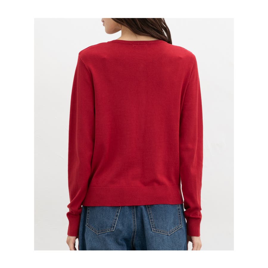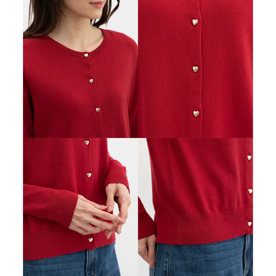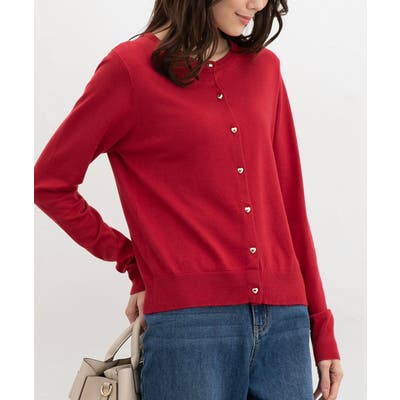 クルーネックのシンプルデザインにハート型のボタンが大人可愛いアクセント。